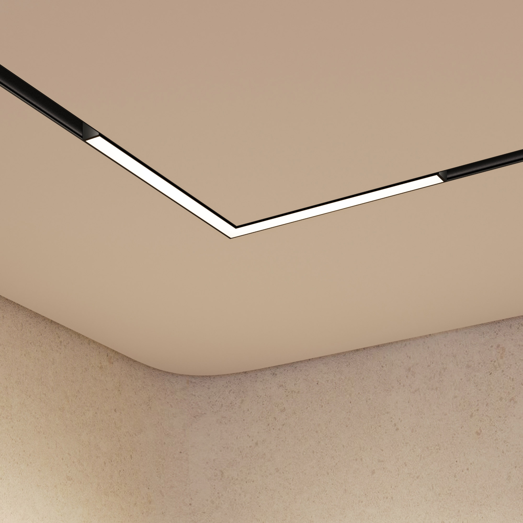 Угловой светильник для магнитных треков MAG-ORIENT шириной 26 мм. Мощность 18 Вт, св. поток 1570 лм, 87 лм/Вт, дневной 4000 K, CRI>92, угол 100°, напряжение питания 48 В. Черный корпус из металла, экран поликарбонат, степень защиты IP20. Размер: длина 295 мм, ширина 295 мм, высота 42 мм. Монтаж на трек MAG-ORIENT. Передает питание между треками. Максимальный ток через светильник 8А. Пульсация <1%.