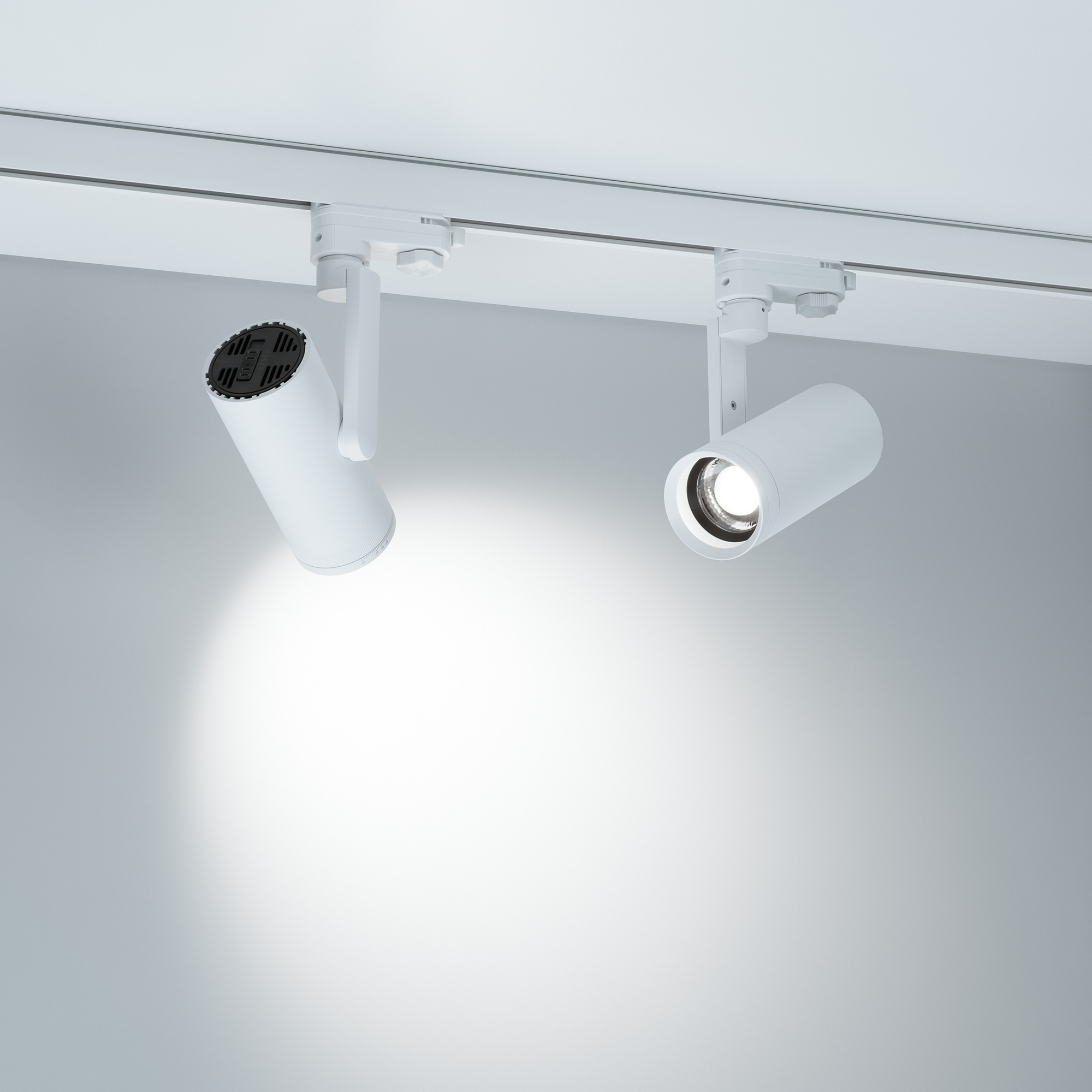 Светильник для треков/шин 4 провода, 10 Вт. Цвет свечения меняется в диапазоне 2700K/3000K/3500K/4000K/5700K (при помощи переключателя на корпусе), световой поток 560-830лм, регулируемый угол 20-50°, CRI>90. Корпус круглый, алюминий, цвет белый, IP20. Угол наклона корпуса 90°, угол поворота корпуса 330°. Габариты LxWxH: 83х65x245мм. Размер светового модуля DxL: 65x150мм. Входное напряжение AC220-240V, мощность 10Вт. Драйвер встроенный 30-40V, 230мА, 10Вт.