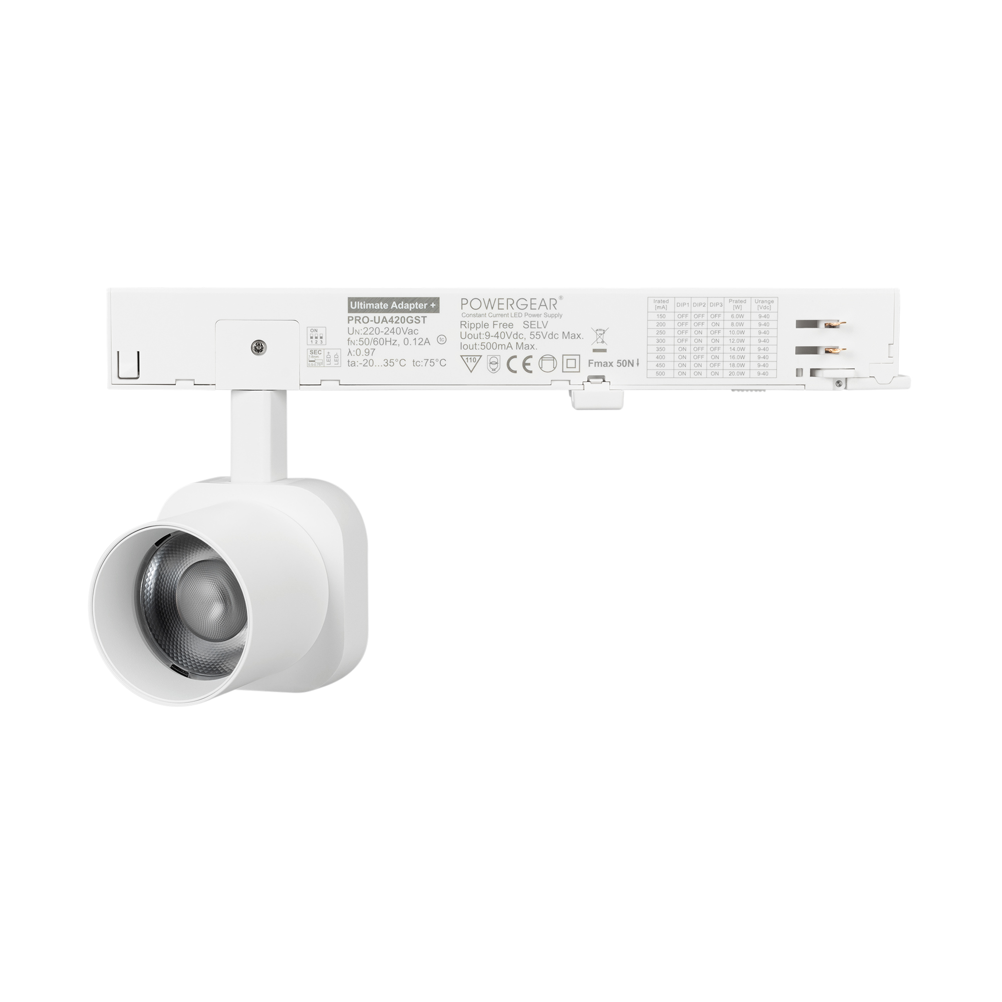 Светильник для треков/шин 4 провода. Мощность 10 Вт, св. поток 650 лм, 65 лм/Вт, дневной 4000 K, CRI>95, угол 20°, напряжение питания 230 В. Решетка HONEYCOMB в комплекте. Белый квадратный корпус из алюминия, материал линзы PC поликарбонат, степень защиты IP20. Размер световой части 60х60х62 мм. Монтаж на трек 3-фазный. Драйвер встроенный 9-40 В, 250мА., пульсация <1%