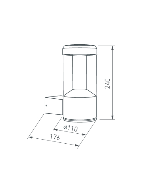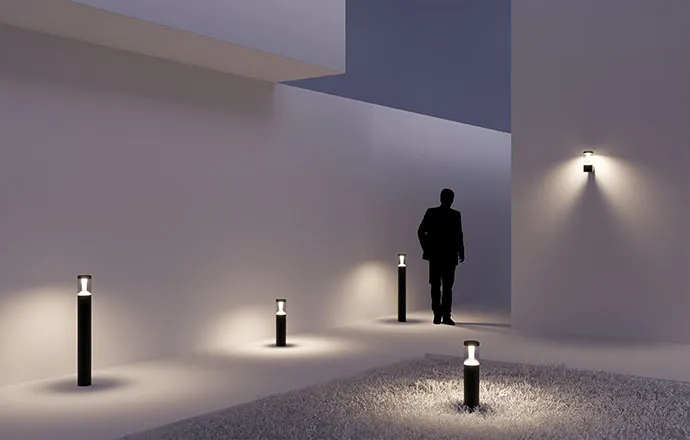 Цилиндрические светильники-столбики высотой 500 или 900 мм и настенные светильники с влагозащищенным корпусом темно-серого цвета. Светильники излучают мягкое, приятное для глаз свечение.