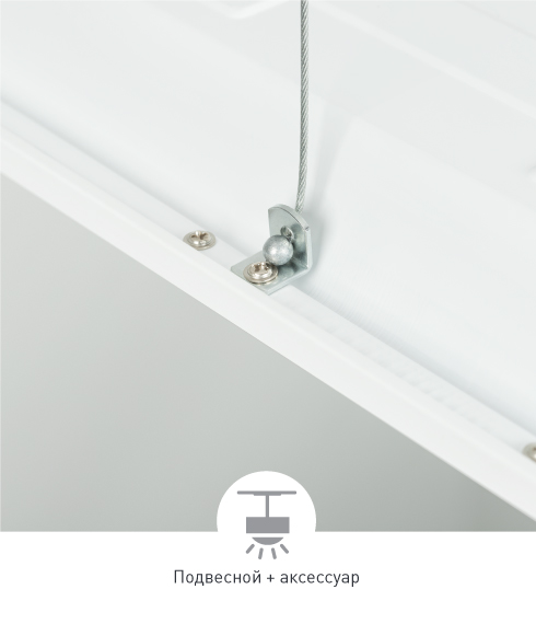 Доступны три способа монтажа: накладной, подвесной и в ячейку Т-профиля. Для подвесного монтажа можно приобрести комплект из 4 тросов SPX-T4. Длина подвесов легко регулируется цанговыми зажимами. Светильники поставляются в комплекте с драйвером и подключаются напрямую к сети 230 В.