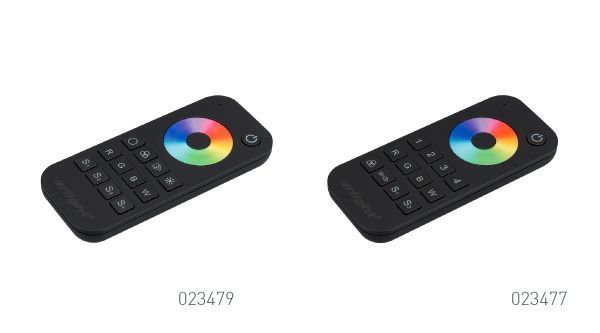 Оба пульта имеют удобное сенсорное кольцо для выбора цвета и кнопки для регулировки яркости, запуска программ и изменения их скорости. Пульт SMART-R26-RGBW позволяет управлять четырьмя независимыми световыми зонами и имеет 2 кнопки сохранения понравившихся режимов. Пульт SMART-R28-RGBW – однозонный, но при этом оснащен 4 кнопками памяти.