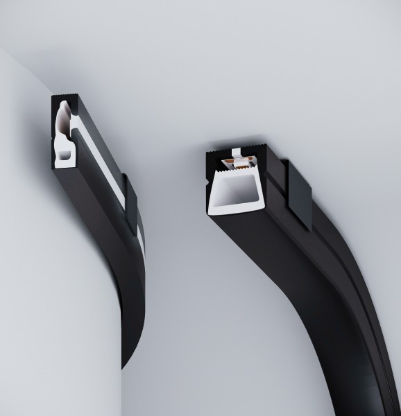 Линии света на темной поверхности, незаметные в выключенном состоянии, — это возможно с новинками гибких силиконовых профилей WPH FLEX в стильном черном цвете. Профили поставляются в катушках по 5 м и оборудованы встроенной ниткой для протяжки ленты, что упрощает процесс установки. Возможность герметизации до IP65 делает данные профили отличным решением не только для оформления интерьера, но и для подсветки входных групп и фасадов зданий.