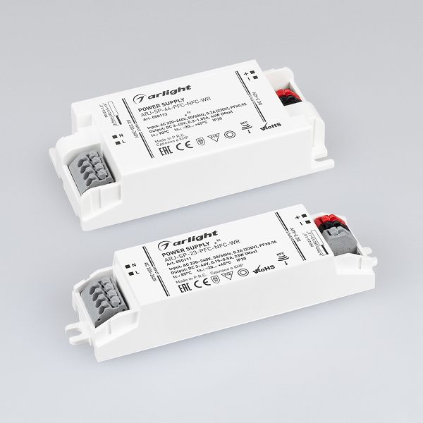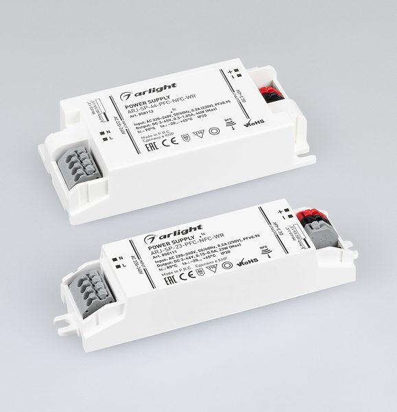 Новая серия источников питания ARJ SP NFC использует технологию NFC для установки значения выходного тока. Это позволяет выставить любое значение характеристики в рамках заданного диапазона с точностью до 1 мА. Параметры устанавливаются через специальное приложение на смартфоне* или при помощи считывателя и приложения на ПК.