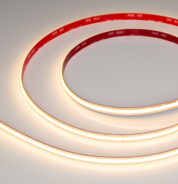Ленты серии COB — одни из самых любимых у клиентов Arlight, потому что образуют сплошное равномерное свечение даже без применения рассеивающих экранов.
