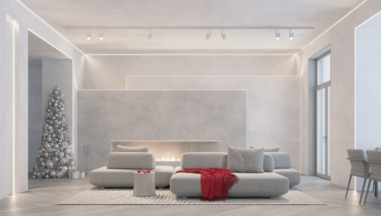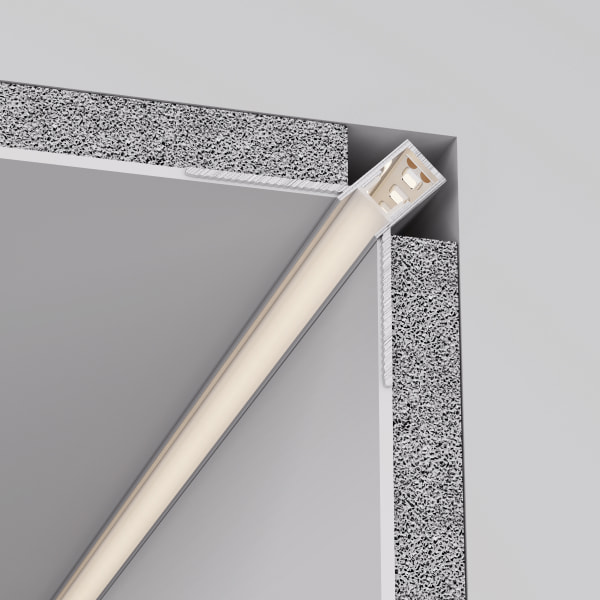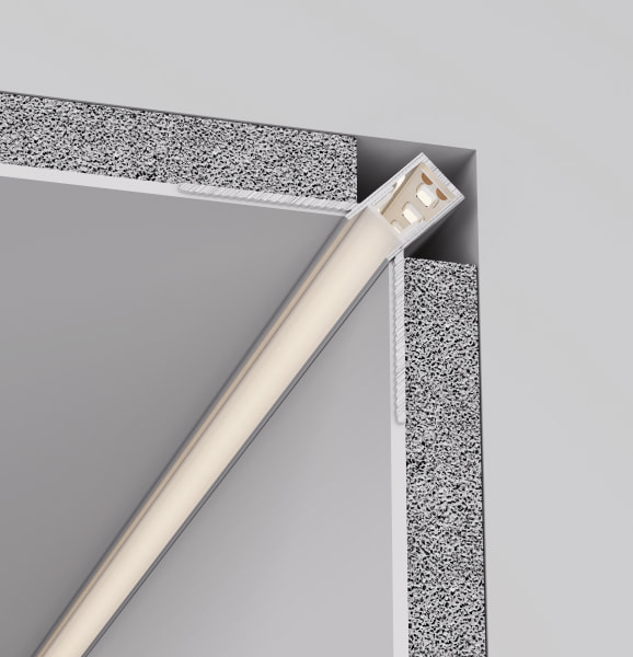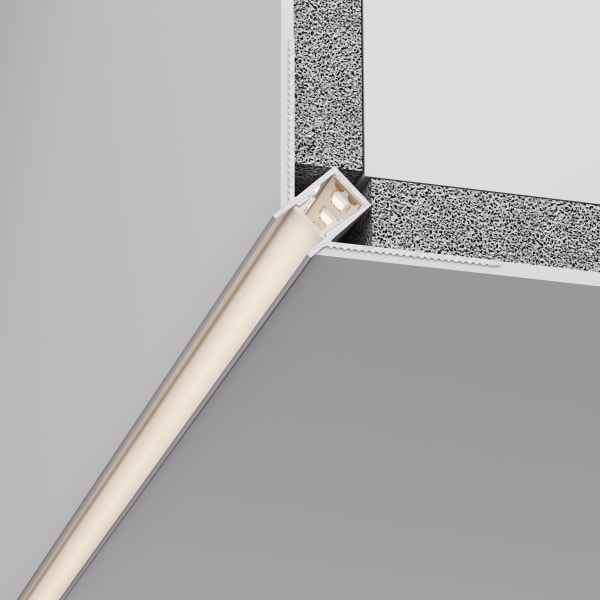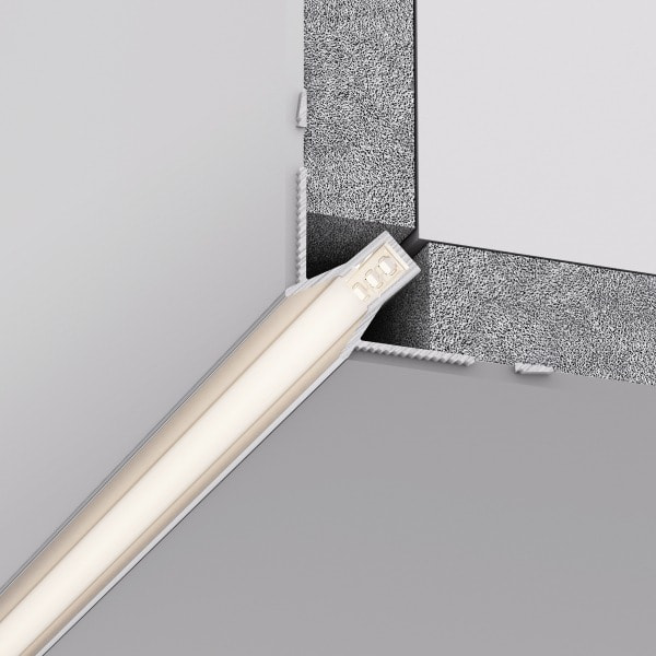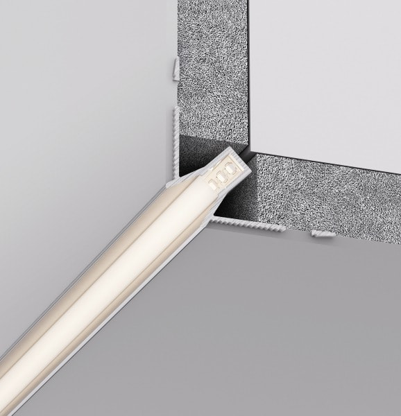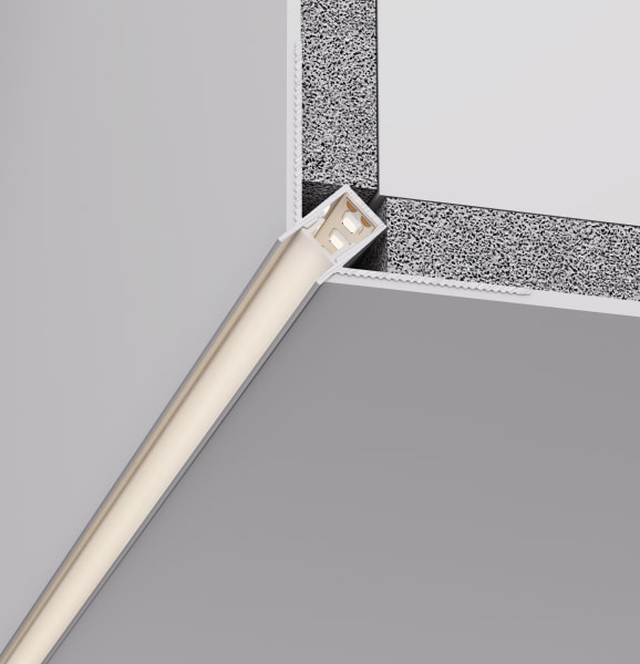 Углы тоже могут стать эффектным элементом в интерьере. Выделите контуры пространства изящной подсветкой на основе встраиваемых угловых профилей DECORE S6 COMFORT со скрытым фланцем.