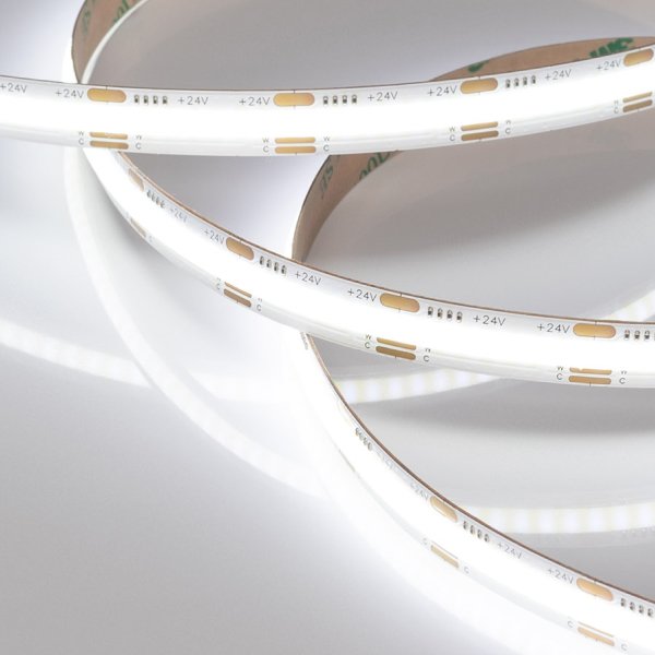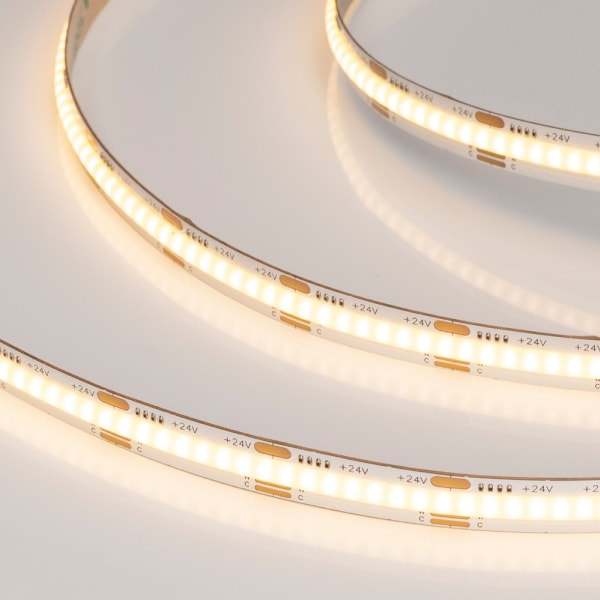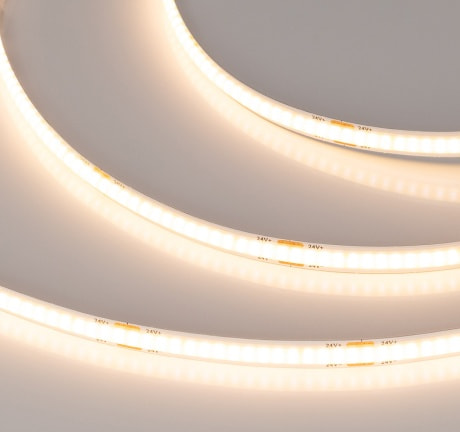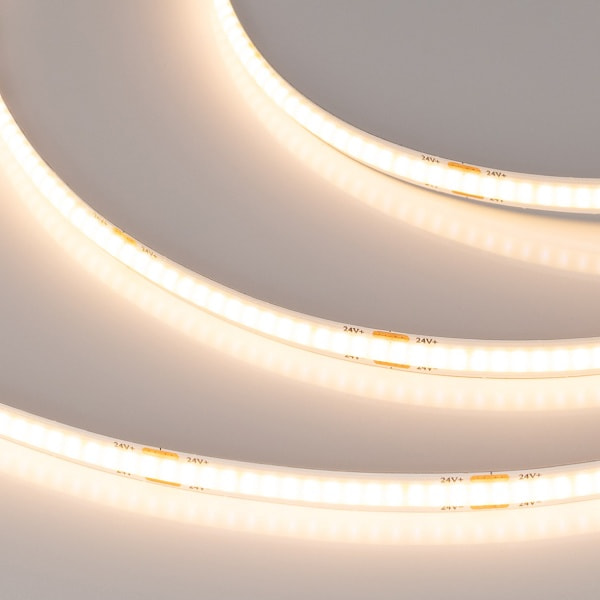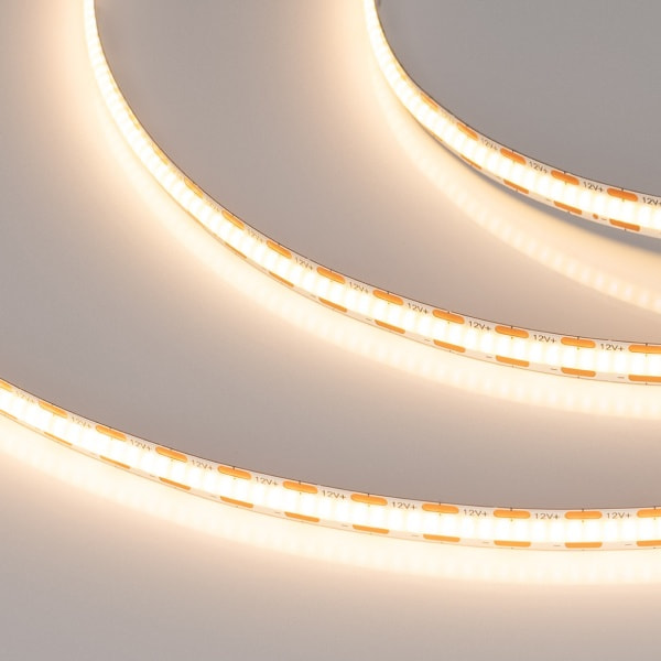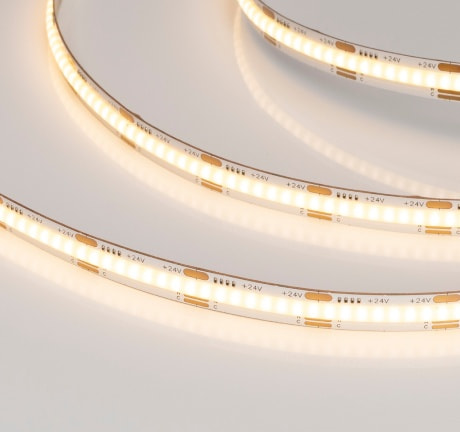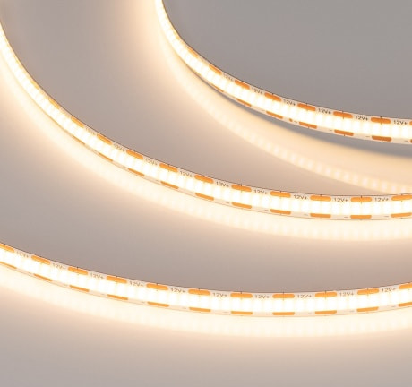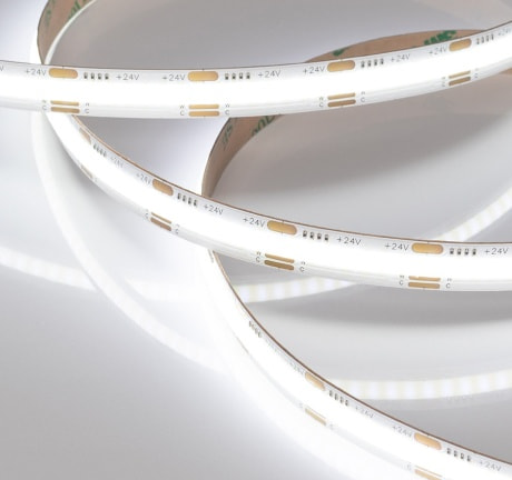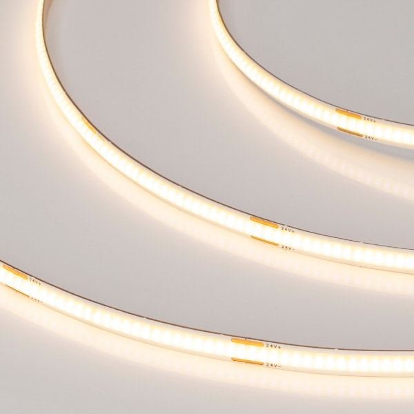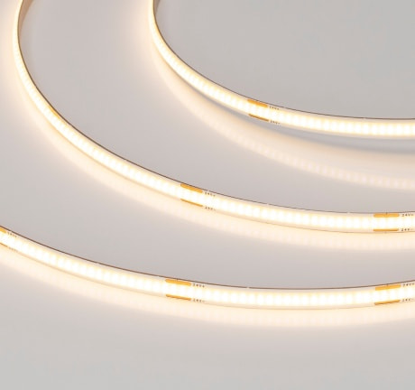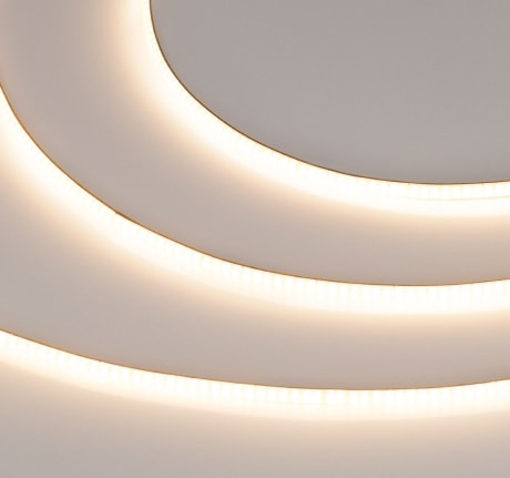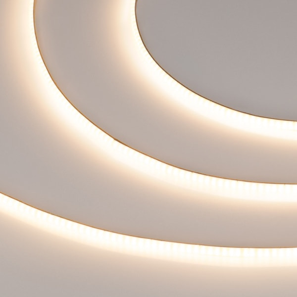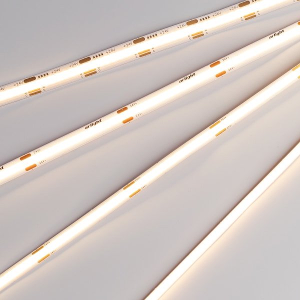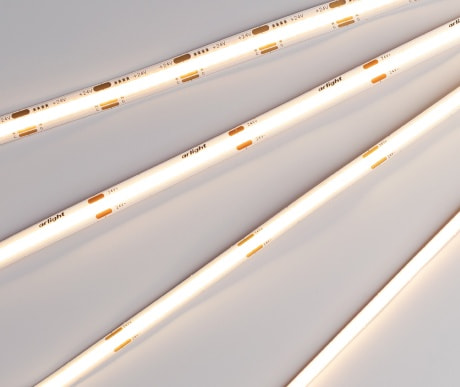 Основное преимущество линейки COB — эффект сплошной линии света без применения рассеивателей. За счет заливки люминофором по всей длине ленты образуется равномерное свечение без видимых точек светодиодов.