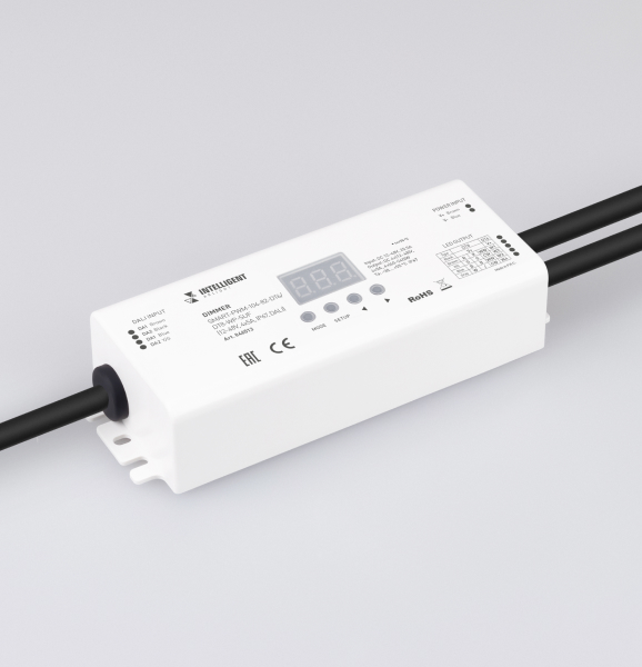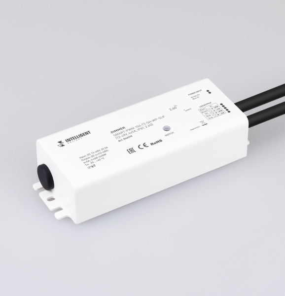 Влагозащищенный RGBW-диммер серии SMART для тех, кто ищет надежное и универсальное устройство для управления освещением как в помещении, так и на улице. С увеличенным до 48 В диапазоном рабочих напряжений и максимальным током 4 А на канал этот диммер способен эффективно управлять различными источниками света.