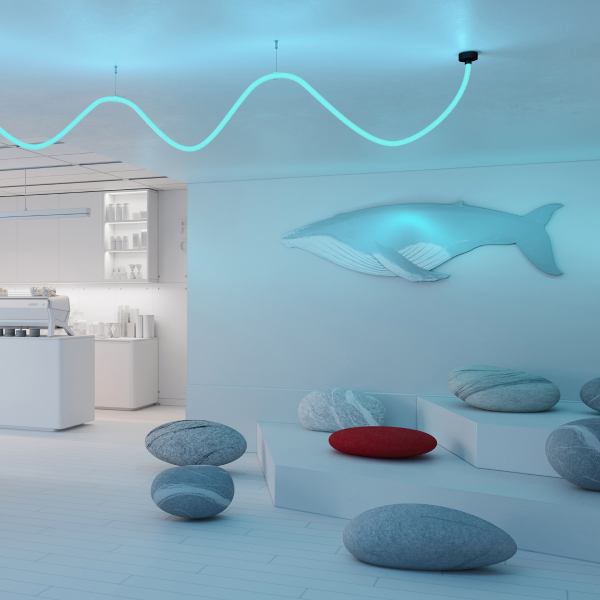 Эпатажная гостиная в тропическом стиле, а может, минималистичный кабинет с ярким световым акцентом? Светильник со свечением 360° из гибкого силиконового профиля WPH FLEX ROPE станет не только элементом локального освещения, но и стильной декоративной инсталляцией.