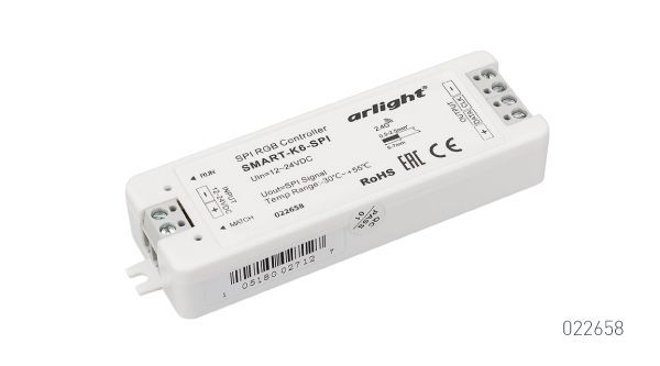 Контроллер SMART-K6-SPI поддерживает все необходимые функции для простого и удобного управления лентами «Бегущий огонь»: включение и выключение освещения, регулировку яркости свечения, скорости выполнения динамических программ. В памяти контроллера есть 32 встроенных светодинамических сценария. Кроме того, первоначальная настройка контроллера позволяет выбрать тип светодиодной микросхемы, указать длину ленты (до 1024 пикселя), задать последовательность RGB.