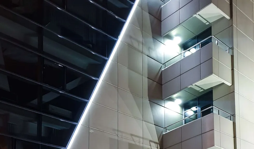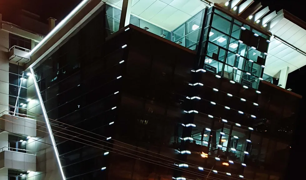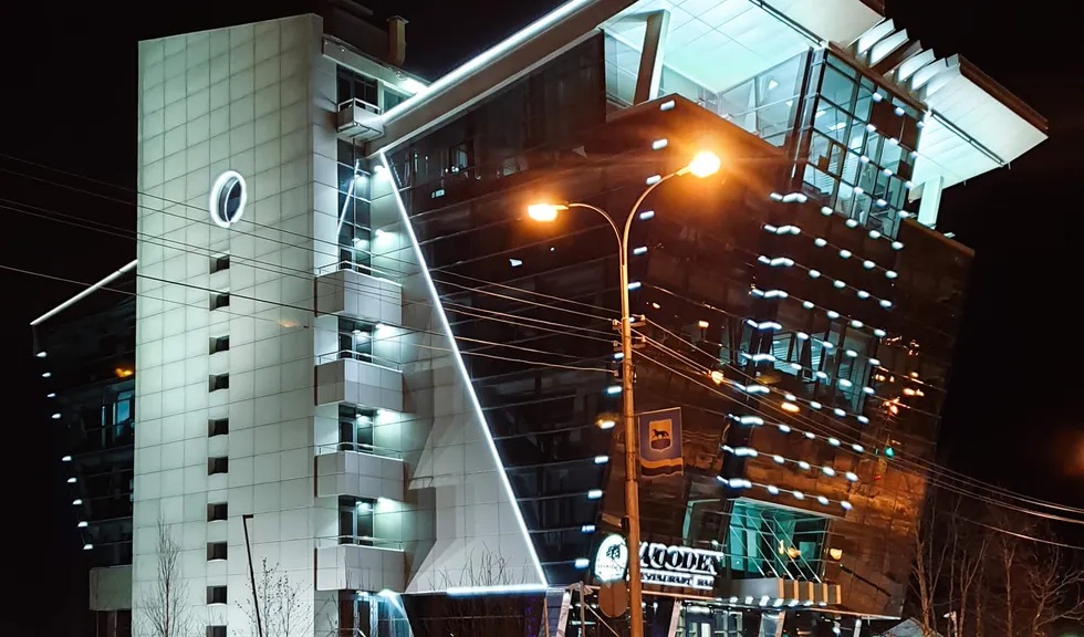 Оригинальный архитектурный облик в сочетании с блестящим стеклом, холодным металлом, серым бетоном и яркими световыми линиями. Чтобы сделать подсветку здания бизнес-центра, было использовано 250 метров герметичного гибкого неона белого цвета свечения.