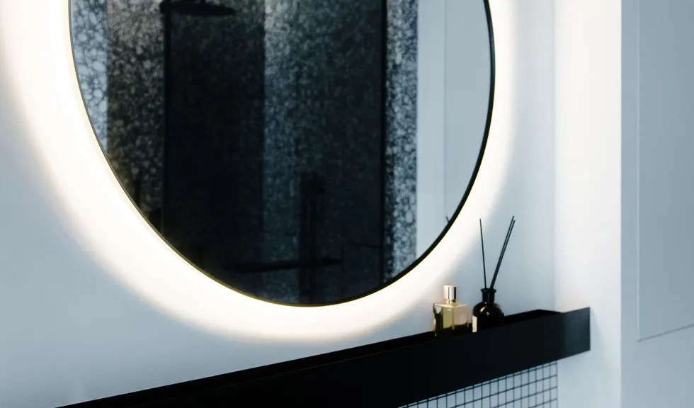 В гостиной парящий потолок гармонично соседствует с частью бетонного потолка без отделки. Подсветка стильного фиолетового свечения привносит свежесть и становится ярким акцентом в интерьере. Говоря об остальных источниках освещения, можно наблюдать общую концепцию лаконичности. Аккуратная акцентная подсветка теплого белого свечения разбавляет холодную цветовую гамму в интерьере.