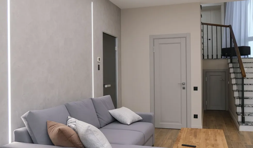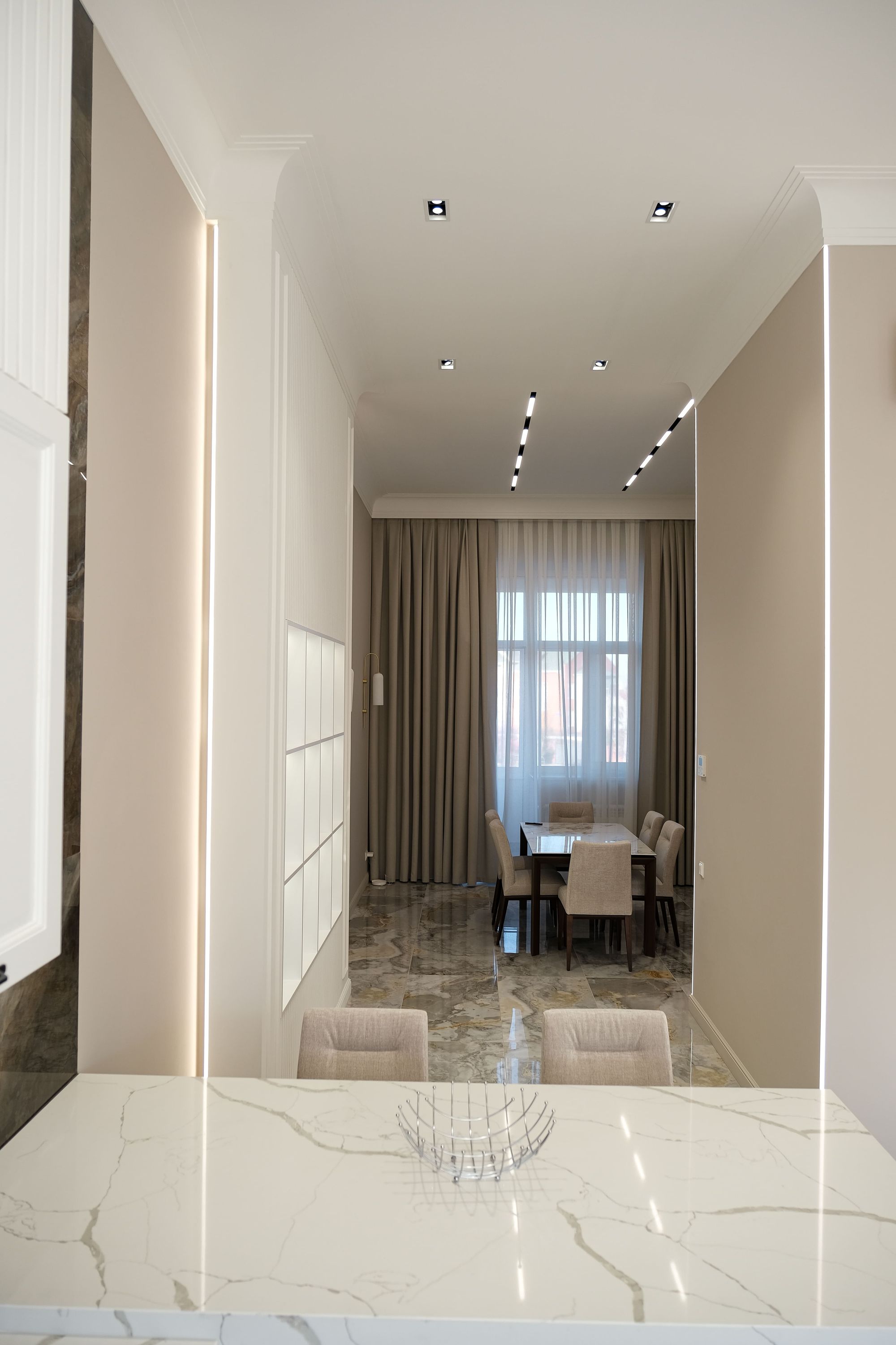 За исключением изящных декоративных люстр в одной из спален в классическом стиле и в ванной с элементами барокко, источники освещения по-современному лаконичны. Встроенные линии света и закарнизная подсветка применены практически во всех помещениях: они не только придают воздушности пространству и подчеркивают его геометрию, но и являются объединяющим элементом всех комнат в доме.