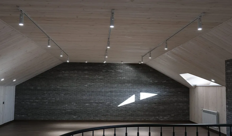 Особым местом в коттедже является мансарда. Отделка стен светлым деревом визуально расширяет помещение и не поглощает свет, который почти не поступает через небольшие окна. Трековые подвесные светильники GERA с узким углом излучения создают локальное освещение в центре комнаты, тем самым не засвечивая пространство. Аккуратные накладные светильники серий MONA и SP круглой формы обеспечивают освещение на участках комнаты с невысоким или скошенным потолком.