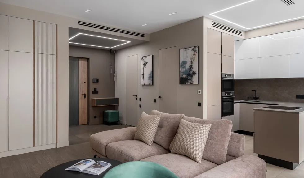 В проекте применяются линии света на основе светодиодных лент с очень высоким индексом цветопередачи (CRI>98), что приближает их свечение к естественному солнечному свету. Благодаря этому пастельные оттенки в интерьере сохраняют свою глубину и насыщенность даже при искусственном освещении.
