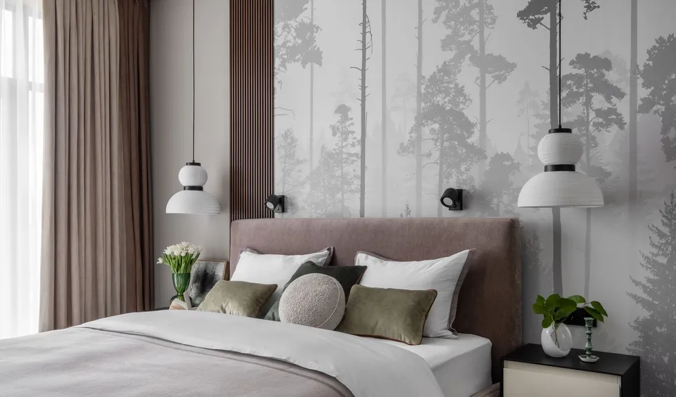 Месторасположение ЖК Spires во многом определило концепцию интерьера. За панорамными окнами квартиры на Нежинской улице в Москве раскинулся лесной пейзаж, который «проник» и внутрь пространства. Теплая цветовая гамма, состоящая из таупа, серого и белого оттенков, разбавлена элементами освежающего изумрудного цвета, а стены спальни украшены минималистичными фотообоями с изображением туманного леса.