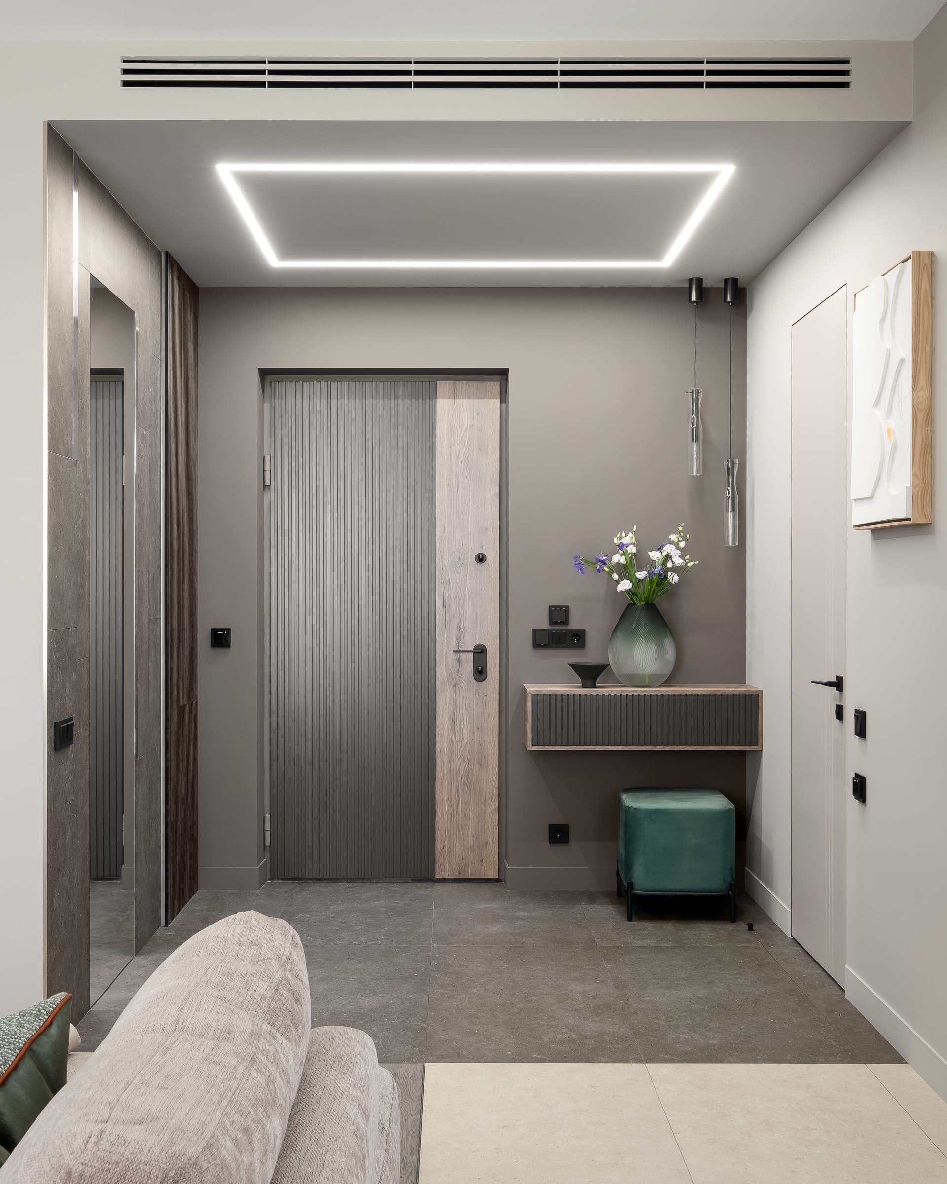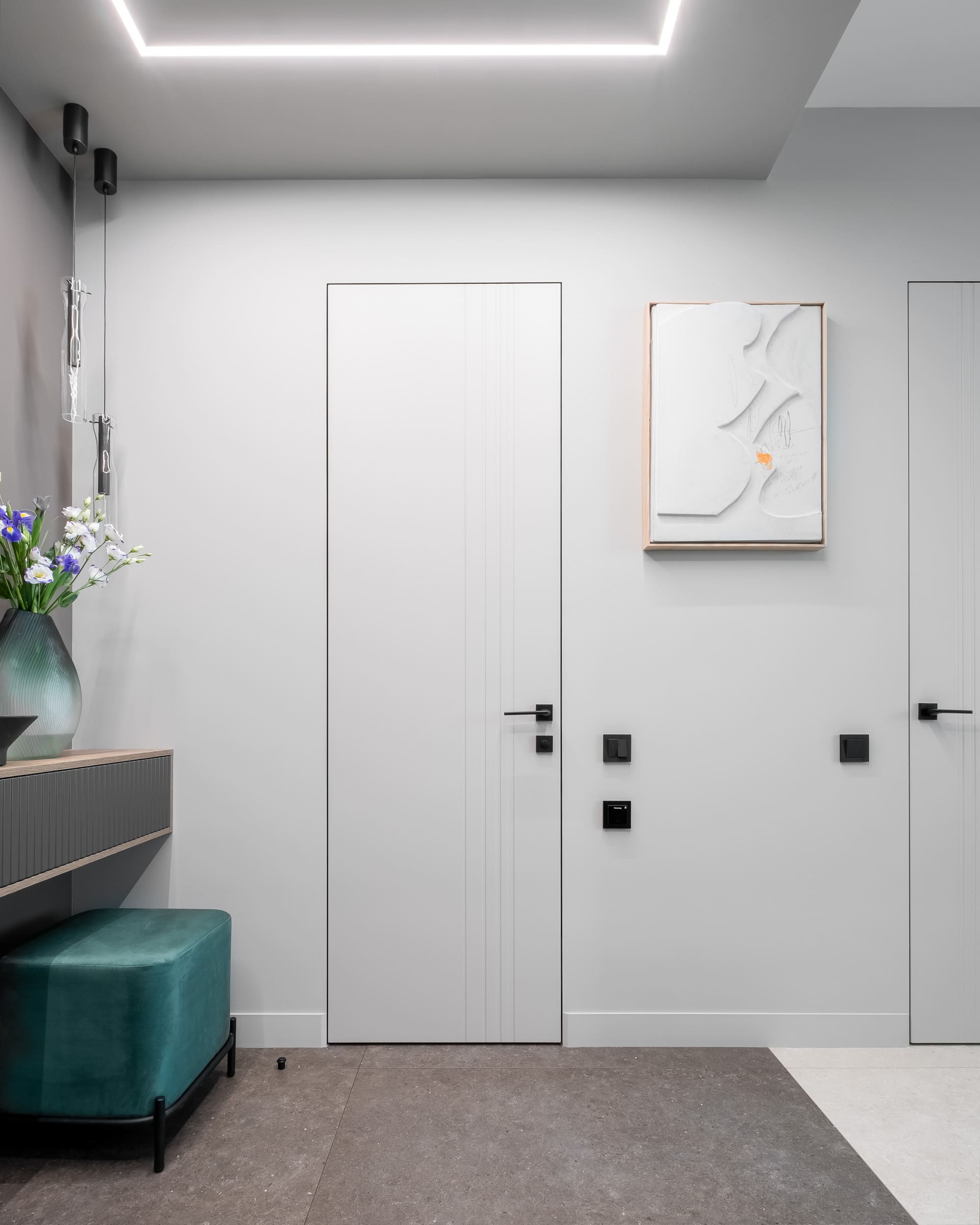 Основной задачей было создать спокойное и не перегруженное пространство, что повлияло на выбор источников освещения. Встроенные в стены и в потолок линии света выглядят минималистично и при этом создают освещение сразу в нескольких плоскостях.