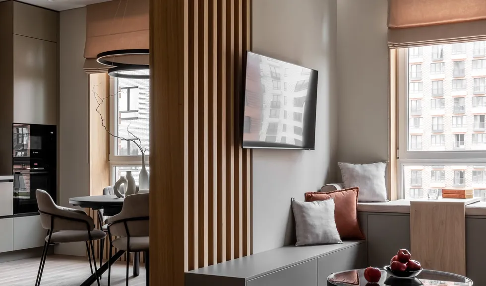 Интерьер квартиры на Большой Филевской улице выполнен в теплых серых, бежевых и кремовых оттенках, которые каждый раз раскрываются по-новому благодаря различным источникам освещения.