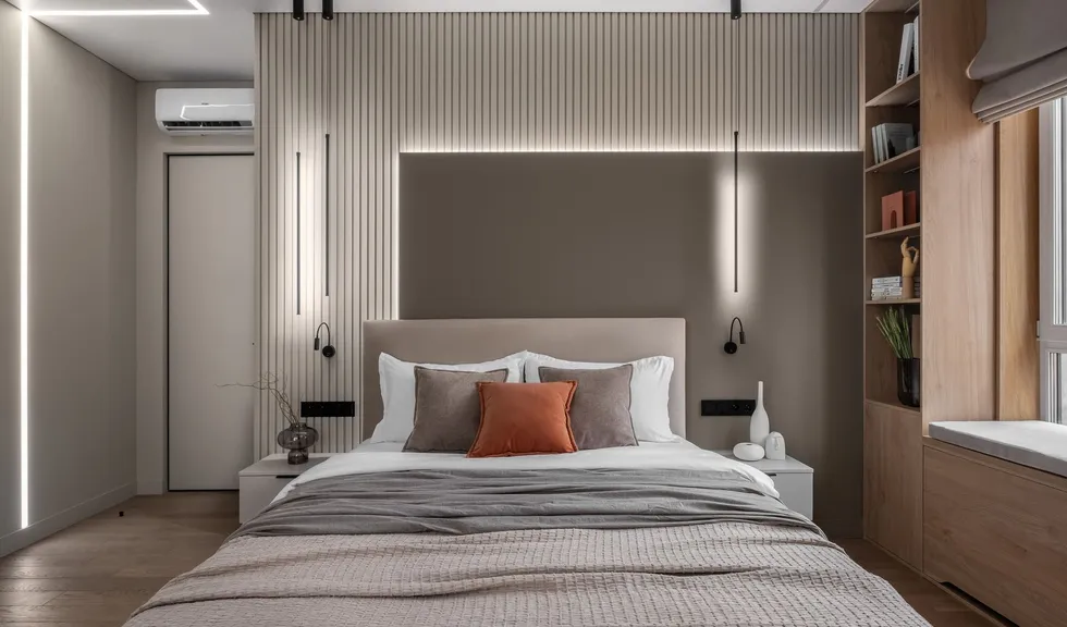 Интерьер спальни продолжает не только общую цветовую, но и световую концепцию. Геометрия пространства вновь очерчена световой линией, спускающейся с потолка на стену. Геометричность прослеживается и в других элементах пространства: стена у изголовья кровати отделана рейками, рельеф которых подчеркнут подсветкой.