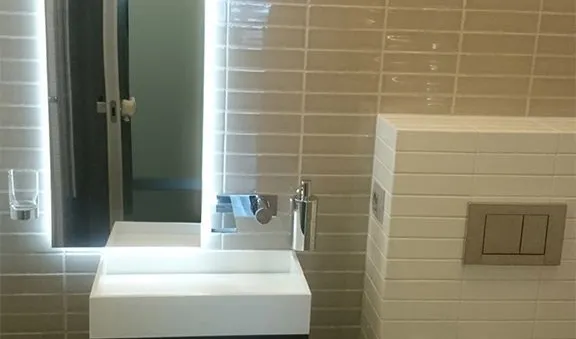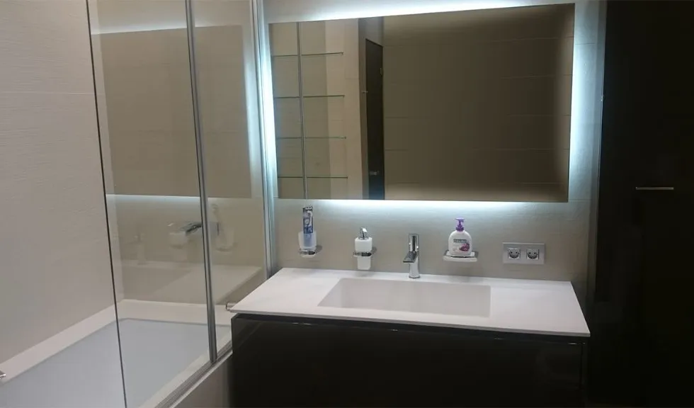 К функциональной подсветке можно также отнести подсветку зеркал в ванной и душевой. С обратной стороны зеркал была смонтирована светодиодная лента Arlight чистого белого цвета свечения. Свет при этом не бьет в глаза, но в то же время делает нанесение макияжа или бритьё куда более комфортным, и не искажает цвета.