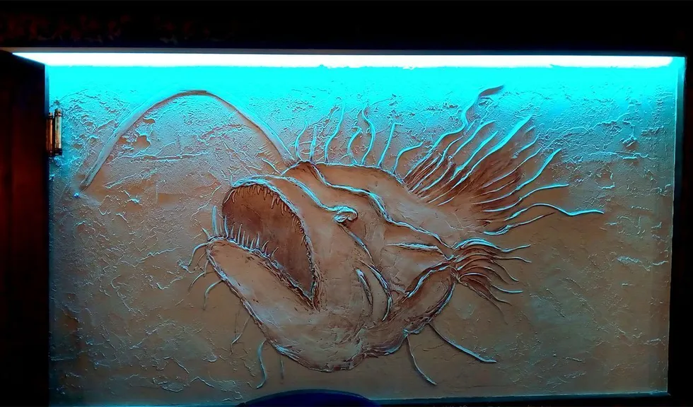 Подчеркнуть выбранную стилистику призвана светодиодная подсветка, которая создала эффект нахождения под водой. Для этого светодиодная лента RGB arlight® была установлена в декоративные, имитирующие дерево, балки под потолком. Лента была также установлена для освещения стенки вентиляционного короба, который одновременно служит для написания барного меню.