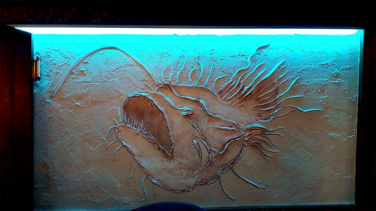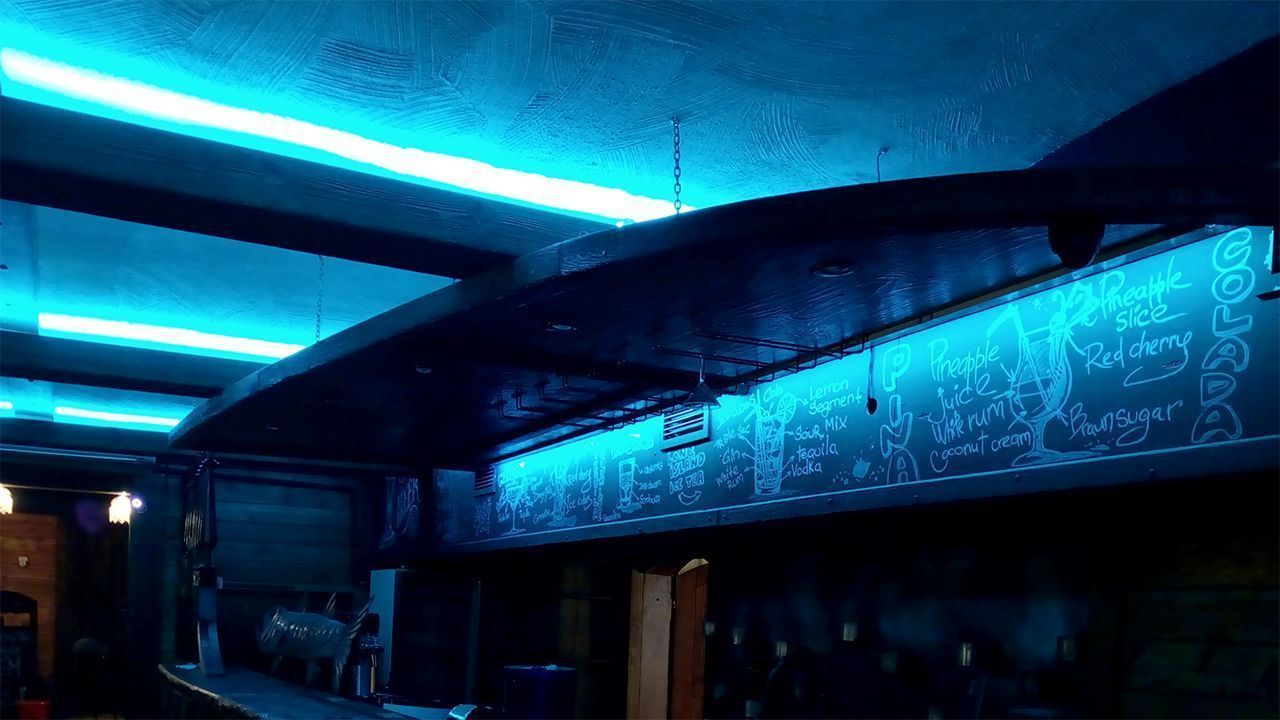 "Морскую" атмосферу создала в баре светодиодная подсветка бирюзового цвета.