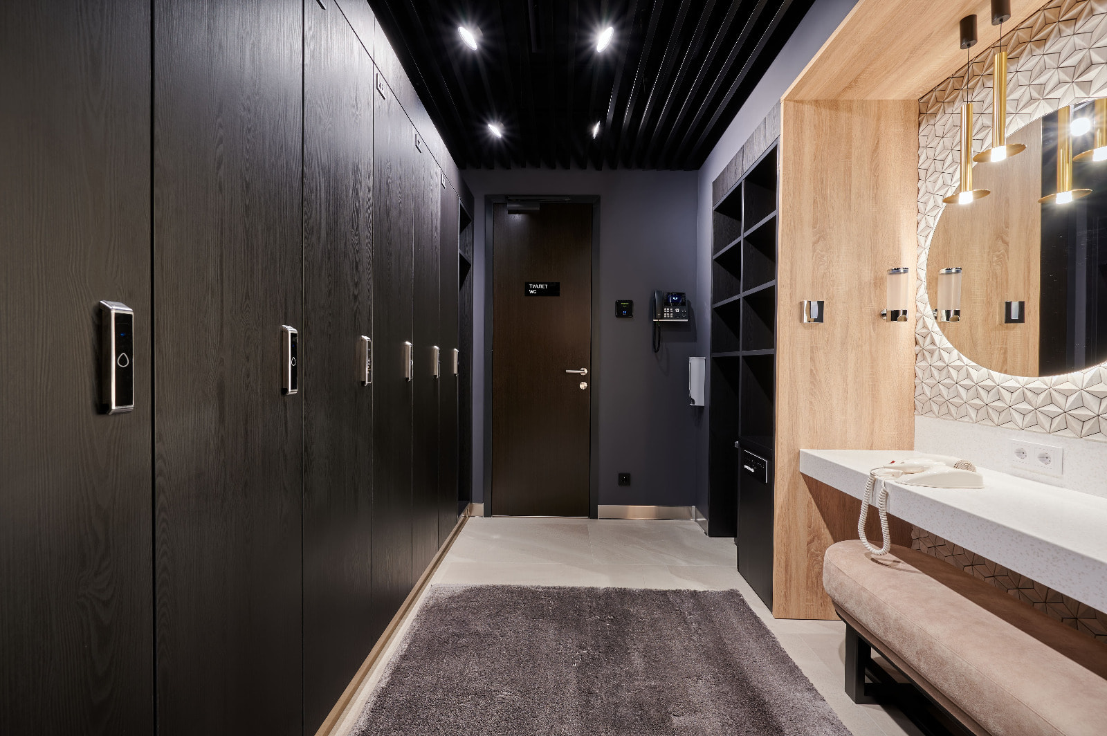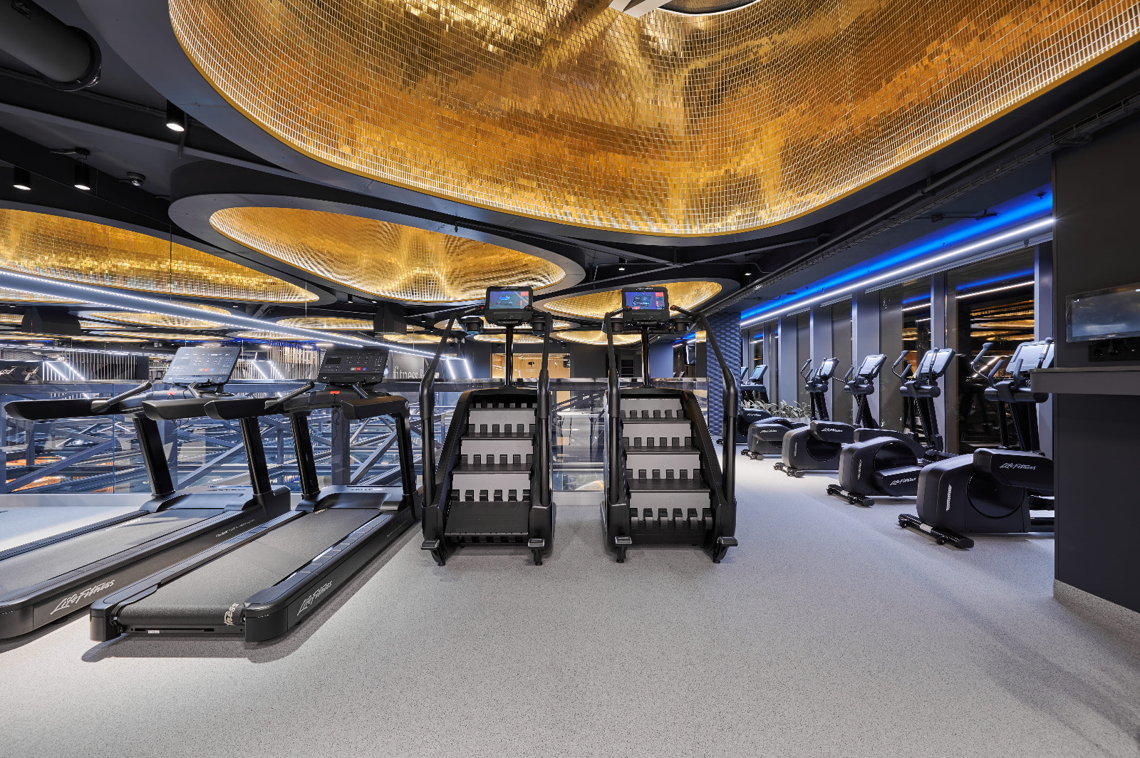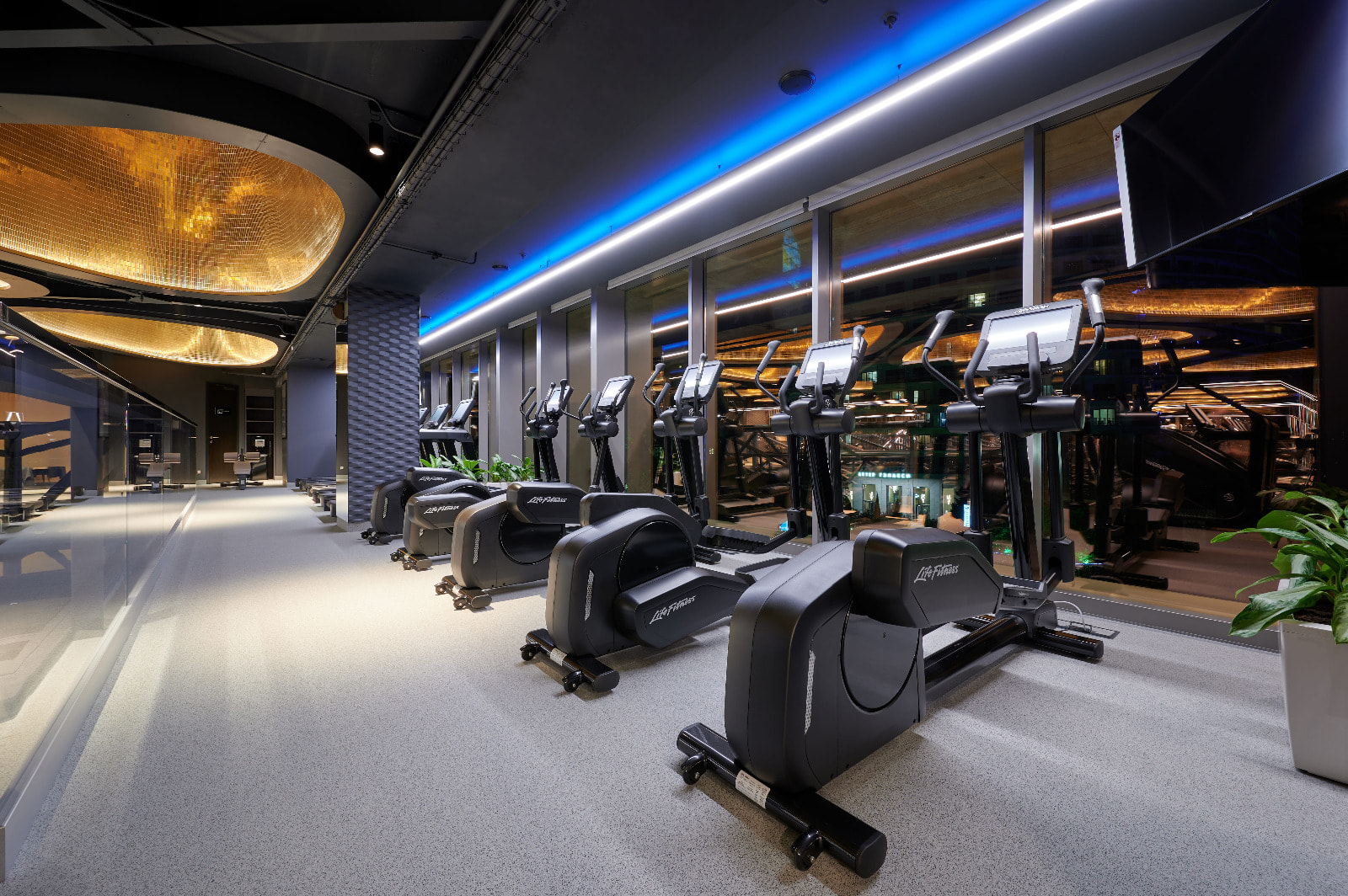 Просторные и стильные тренажерные залы оборудованы новейшей техникой для эффективных и безопасных тренировок. Особую атмосферу в зале создает тщательно продуманное освещение. Оно не только не мешает во время тренировок, но и привносит в пространство футуристические мотивы. Подсветка из линий света холодного белого и синего цветов задает мотивирующий настрой, в то время как золотистая инсталляция на потолке в свете гибкого неона теплого свечения является олицетворением премиальности. Стильные и уютные раздевалки также оборудованы RGB-подсветкой, которая эффектно направлена на открытые потолочные коммуникации. Зеркала подсвечиваются вертикальными линиями света дневного белого свечения, которое лучше всего передает естественные оттенки кожи.