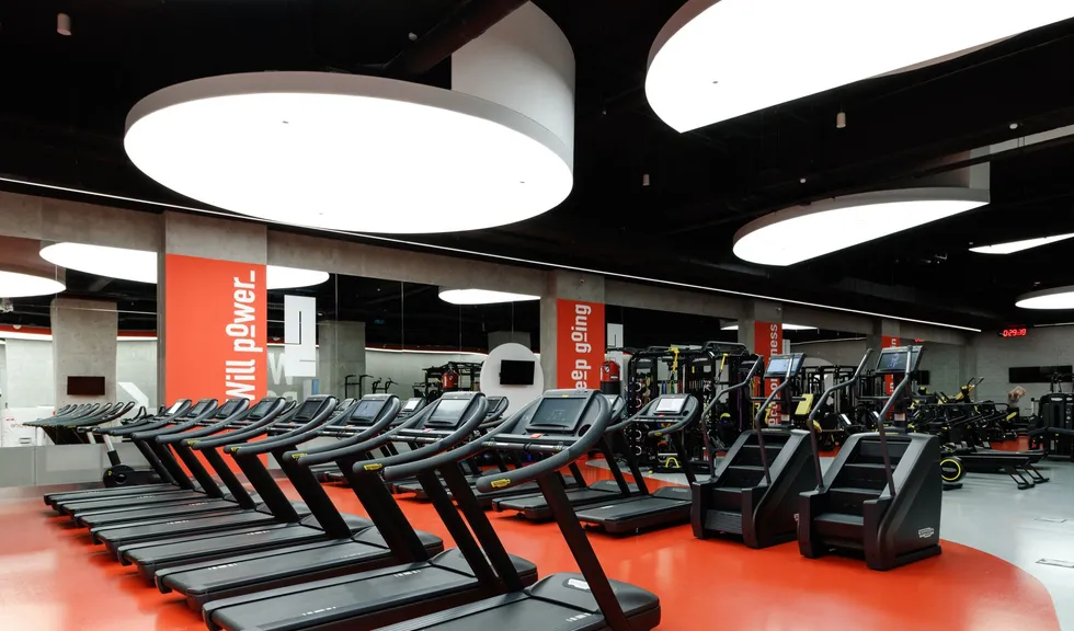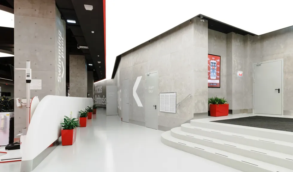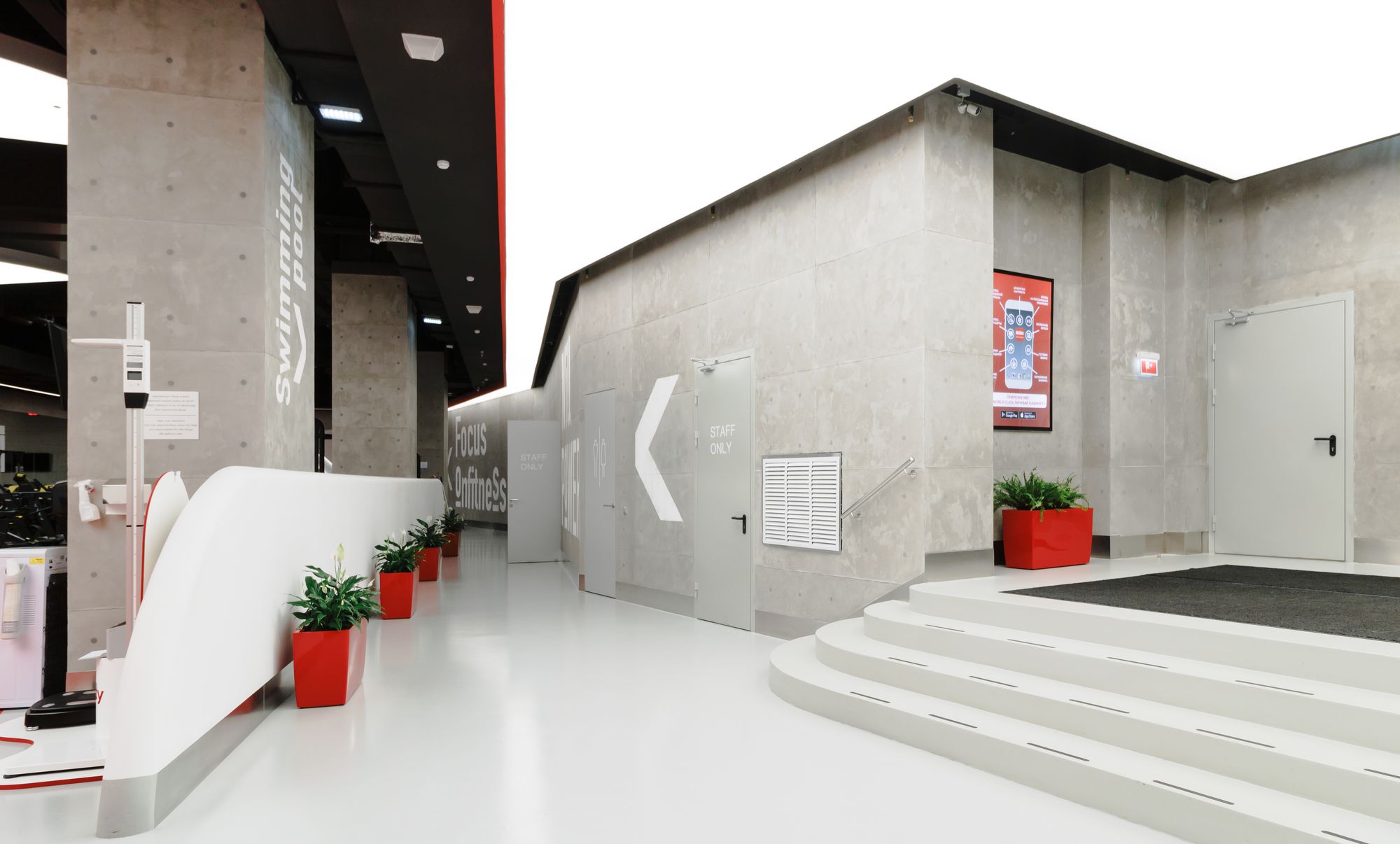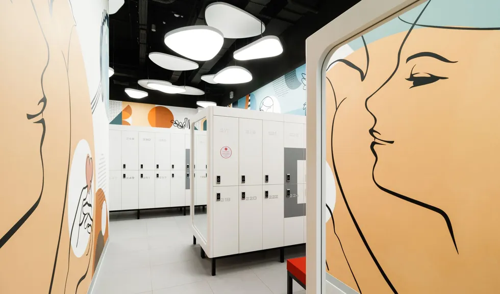 Световой дизайн построен на контрасте белого и красного, широких световых полос и тонких линий света. Линейные светильники с полупрозрачными экранами идеальны для основного освещения. Декоративная подсветка зеркал и других элементов интерьера выполнена светодиодными лентами дневного белого свечения. Границы потолка и стен в фитнес-зонах эффектно подчеркнуты линиями света.
