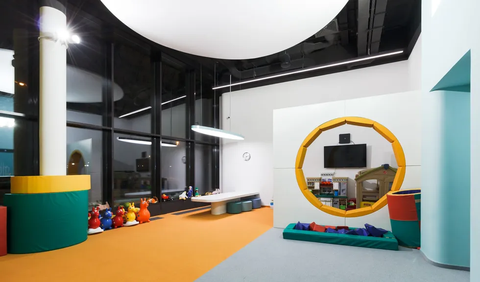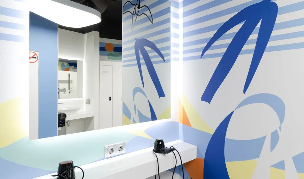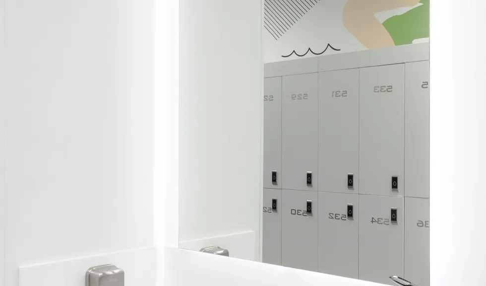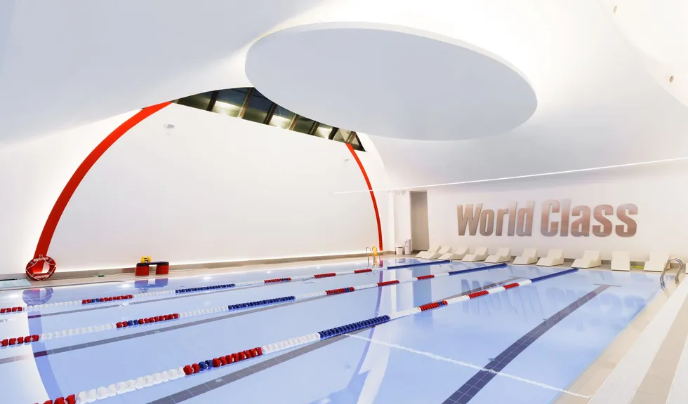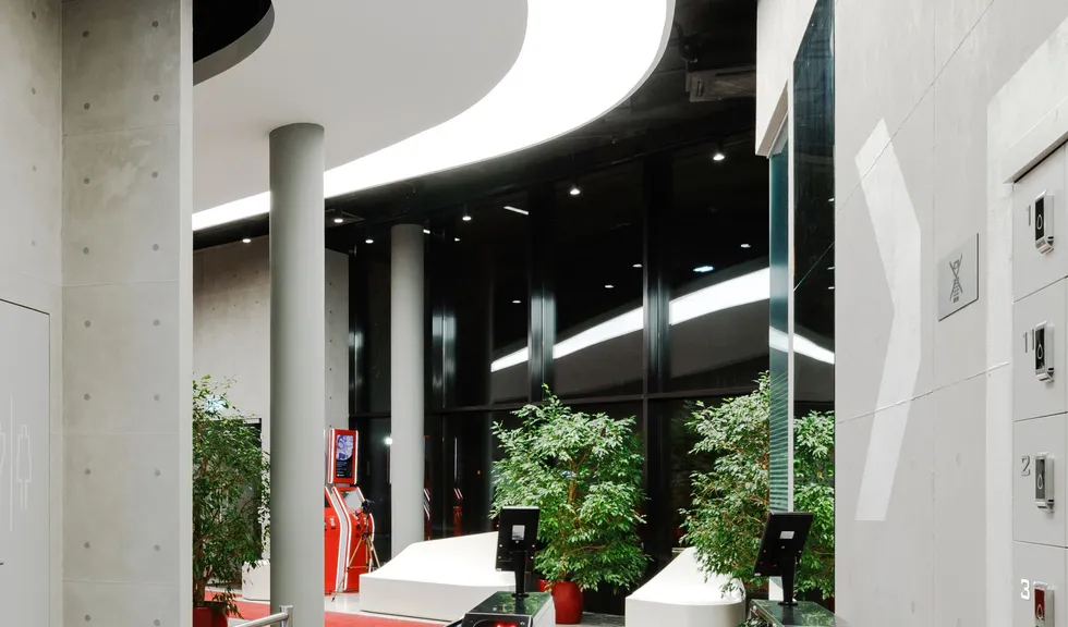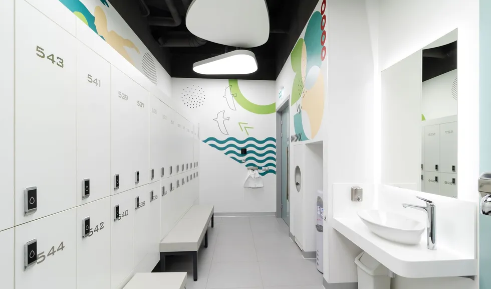 Световой дизайн построен на контрасте белого и красного, широких световых полос и тонких линий света. Линейные светильники с полупрозрачными экранами идеальны для основного освещения. Декоративная подсветка зеркал и других элементов интерьера выполнена светодиодными лентами дневного белого свечения. Границы потолка и стен в фитнес-зонах эффектно подчеркнуты линиями света.