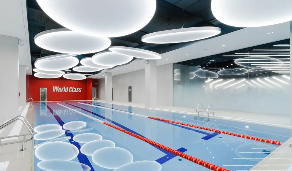 Уникальное пространство, в котором интересно сочетаются разные типы основного освещения и декоративной подсветки. Для проекта было использовано более 30 единиц светодиодного оборудования. Огромные потолочные диски светильников сочетаются с линейными и дизайнерскими подвесными светильниками. С помощью света удалось подчеркнуть масштаб, красоту и легкость интерьеров. Круглые потолочные светильники в зоне бассейна похожи на полную луну. Ломаные линии света напоминают летящие стрелы или разметку бегового стадиона. Светодизайнерам удалось создать пространство, в котором сплелись качественный белый свет и световые иллюзии.