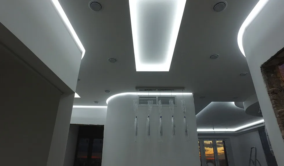 Задачей данного проекта являлось создание фонового освещения по всей квартире. Для этого во многочисленные объемные ниши потолка была установлена светодиодная подсветка.