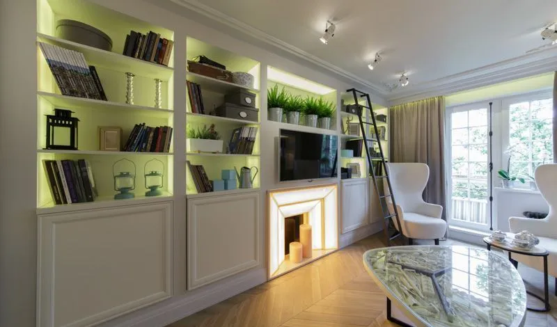 Боковые стенки (стойки) стеллажа, расположившегося вдоль одной из стен комнаты, превратили в лайтбоксы, озарившие внутренне пространство стеллажа мягким рассеянным светом. Для этого была выбрана светодиодная лента arlight® зеленого свечения, которая была установлена внутрь стенок, а затем закрыта матовыми светопропускающими рассеивателями. Такая же лента была применена для подсветки штор.