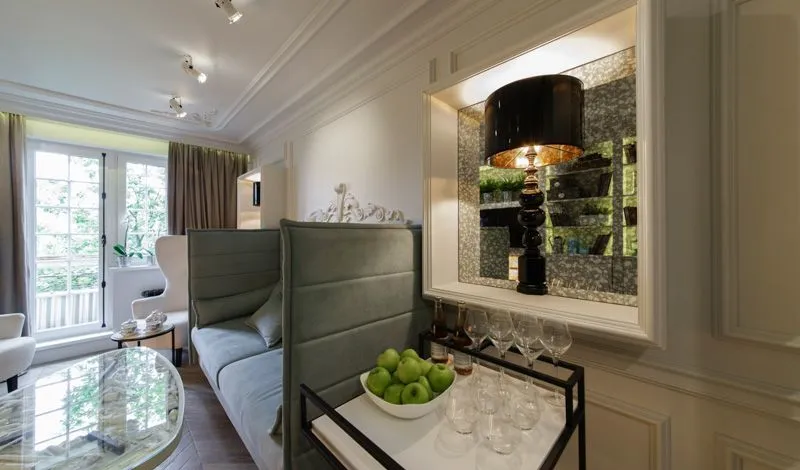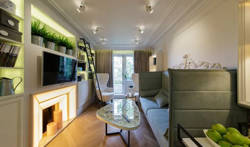 Одним из центральных декоративных элементов стал каминный портал, собранный из фактурного искусственного камня. Он обладает необычным цветом, который удалось получить благодаря использованию дополнительных минералов и цветовых присадок – от сланца до керамики. Красивую поверхность камня подчеркнули светодиодной подсветкой, благодаря чему каминный портал обрёл еще более эффектный вид. Для организации подсветки светодиодную ленту arlight® установили по принципу витражной подсветки - позади камня, по периметру конструкции.