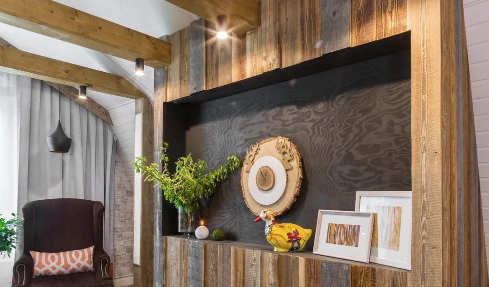 Новые идеи в телепроекте "Фазенда" на мансарде в 42 квадратных метра появилась лесная гостиная. На стене – лес еловый. Есть даже пенек. Перегородка - с осиновой рощей… Дерево, камень, камин. Почти классическое шале. Освещение в гостиной реализовано различными светодиодными светильниками.