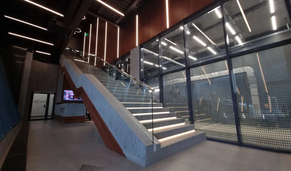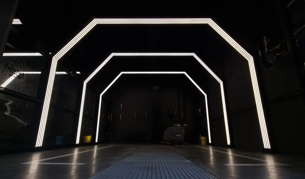 Зона автомойки просторна и функциональна. Световые порталы локально освещают каждую ячейку для мытья машин, а также погружают посетителей в атмосферу фильмов про автогонки и красивые машины. Свечение белого цвета контрастно смотрится на фоне темно-серого интерьера. При этом обстановка эмоционально не давит на посетителей благодаря пирамидальному участку крыши из стекла, через который проходит естественный свет.