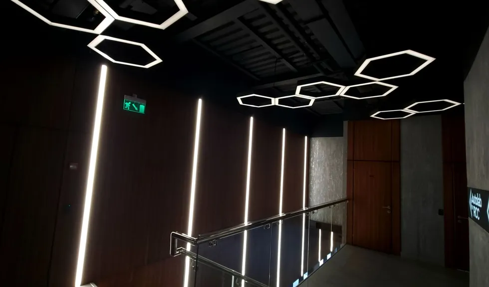 Автомобиль визуально состоит из металла, стекла и света фар — все три составляющих входят в основу лаконичного интерьера МФЦ: темно-серые и металлические оттенки стен, пола и потолка, прозрачные перегородки, зонирующие пространство, и множество световых линий, которые формируют упорядоченную геометрию.