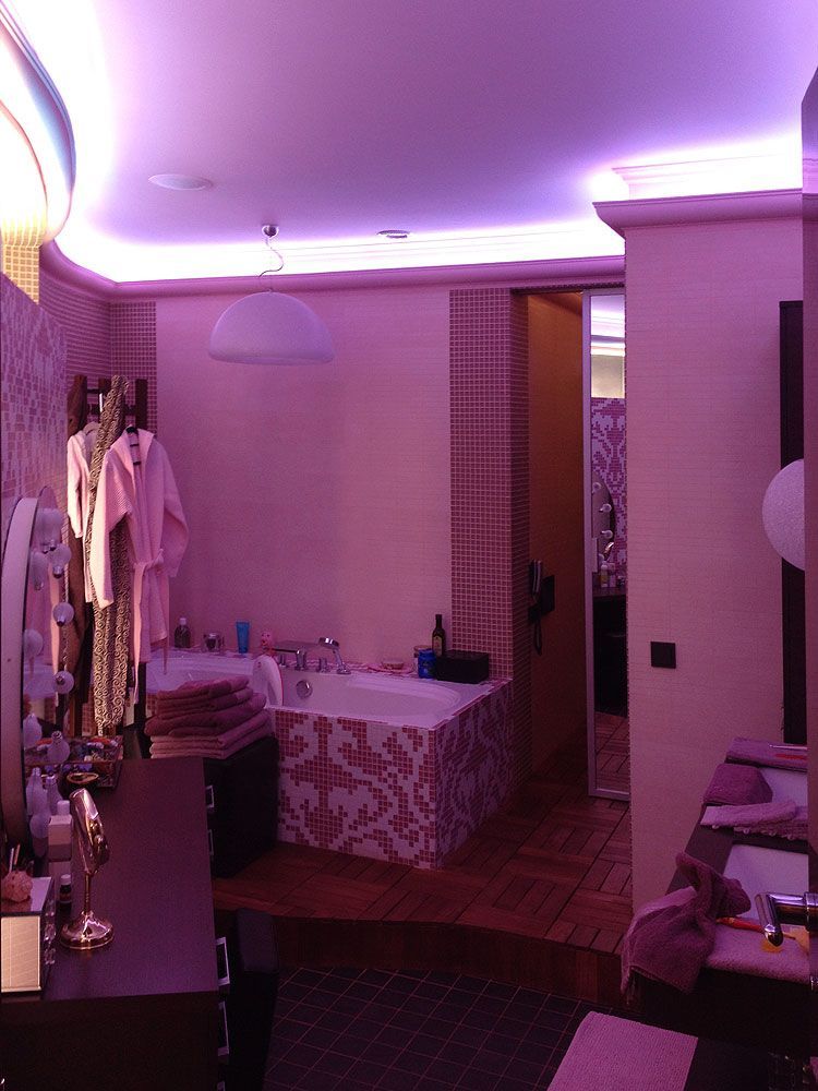 Для подсветки потолочных ниш ванной комнаты применена многоцветная RGB светодиодная лента Arlight, для подсветки портала в ванной - двухрядная светодиодная лента RGBW, обеспечивающая многоцветную подсветку и одновременно натуральное белое свечение.