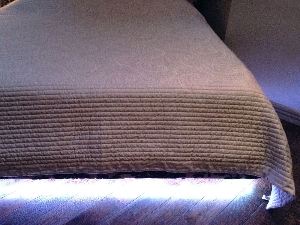 В спальной комнате была установлена подсветка потолочных ниш и кровати, для обеих зон была использована светодиодная RGB лента. Для подсветки кровати лента была установлена по периметру её основания, а свечение направлено вниз, в результате чего получился эффект “парящей кровати”.