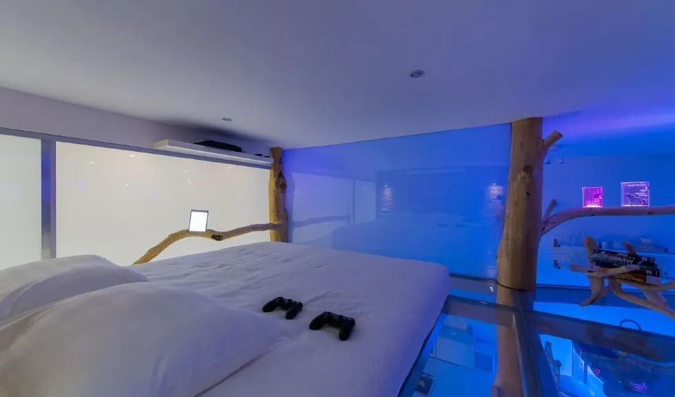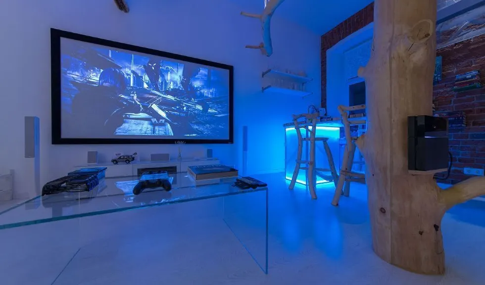 Второй уровень квартиры-студии был выделен для спальной зоны, её отделили от основного пространства необычным стеклом, способным изменять степень прозрачности. Оно было оснащено дополнительной светодиодной подсветкой на основе многоцветной светодиодной ленты arlight®. Мультицветная RGB светодиодная лента arlight® также используется в подсветке основания стола-стойки обеденный зоны студии.