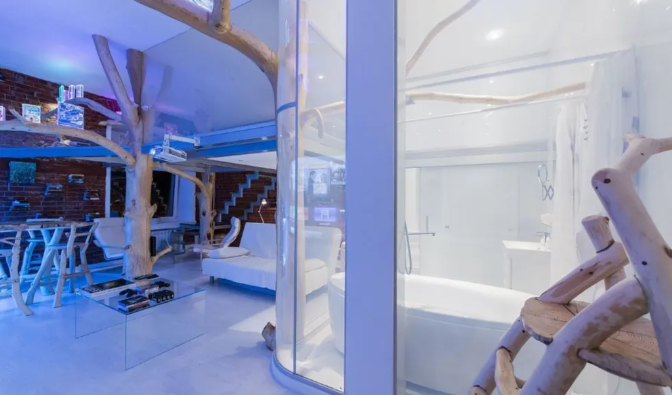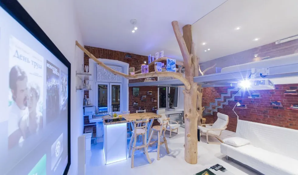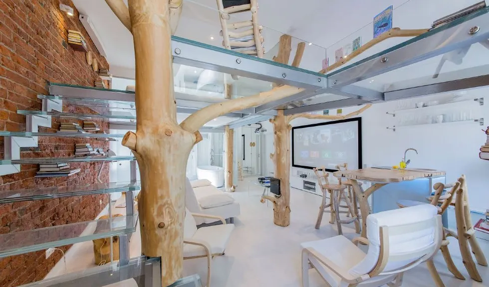 Интерьер данной квартиры-студии привлекает необычным сочетанием современных материалов - стекла и металла, строгих геометрических форм, что характерно для стиля хай-тек, и натурального материала - дерева. Из дерева здесь сделаны не только элементы мебели - обеденная стойка, стулья и кресла, стволы и ветви деревьев буквально окутывают студию. Интереснейший приём - стальные опоры второго уровня студии заключены в стволы деревьев, благодаря чему может возникнуть ощущение своеобразного "домика на дереве".
