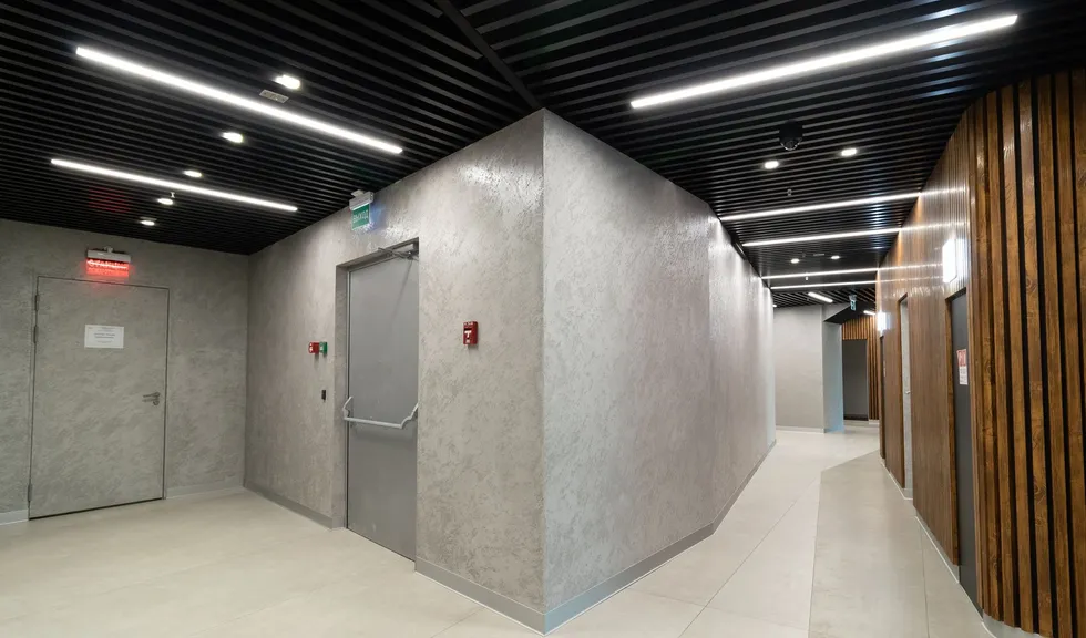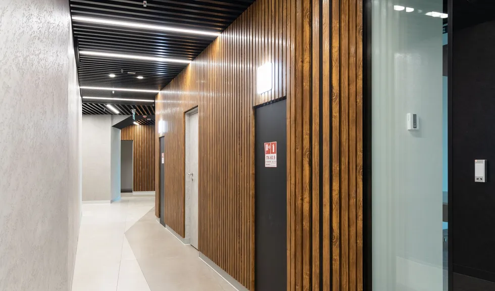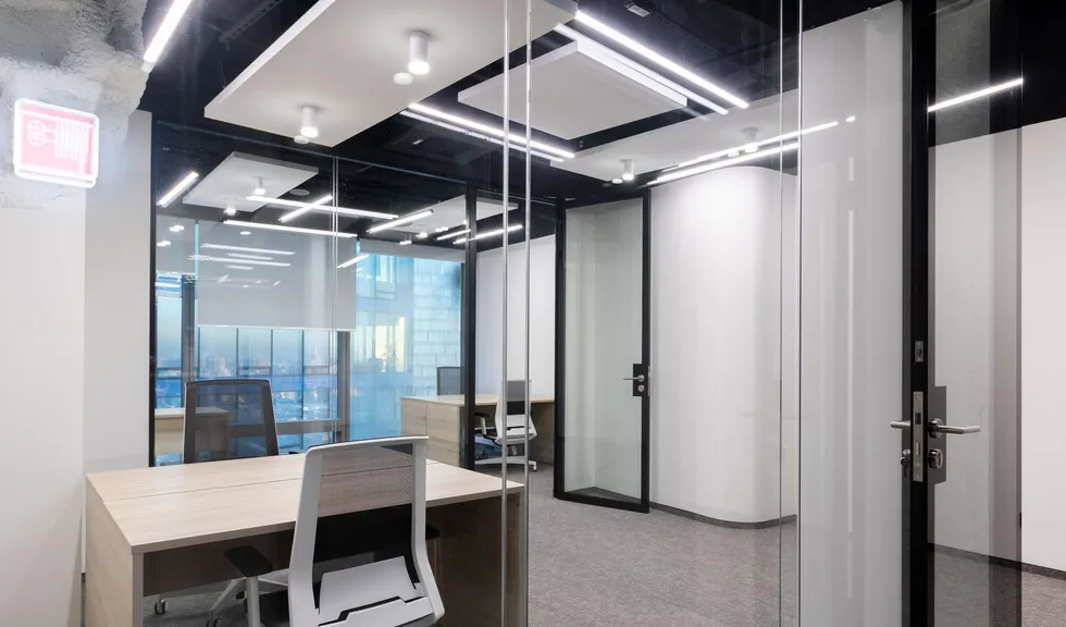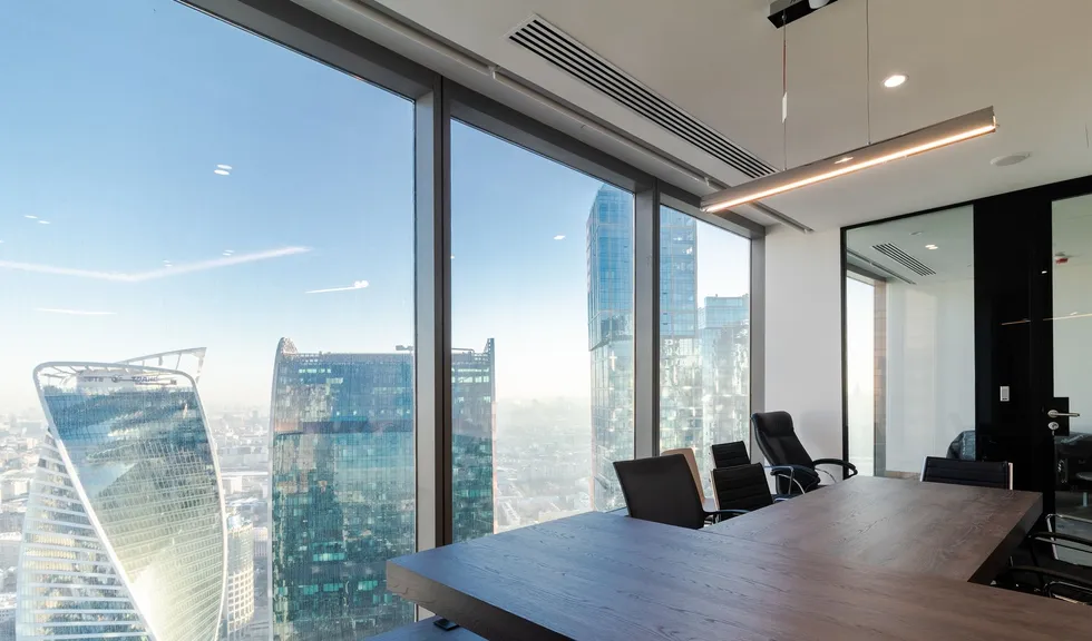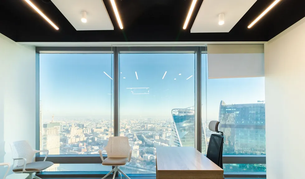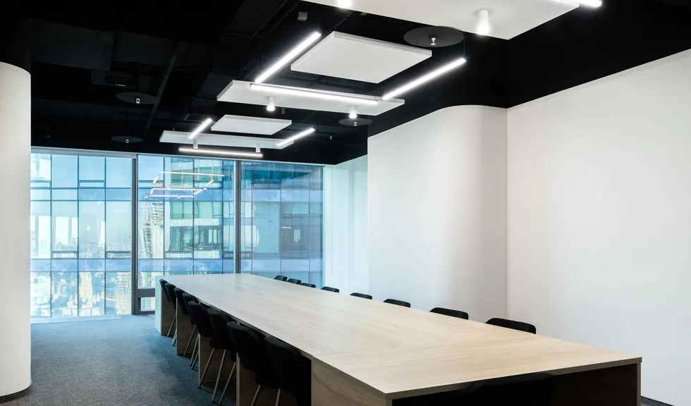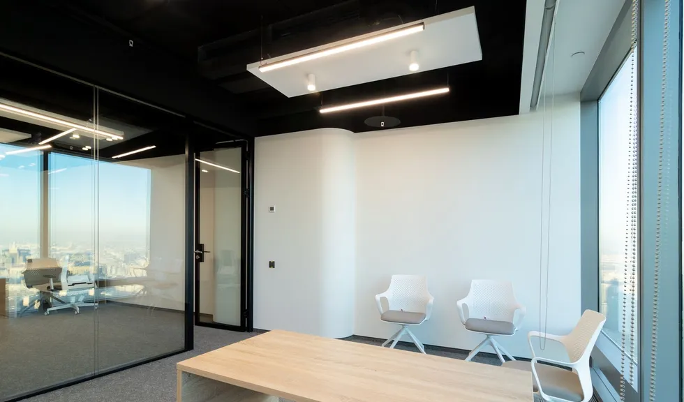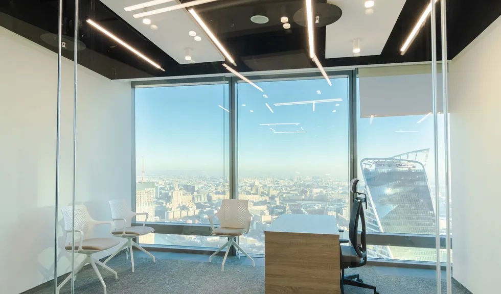 Современный офис с панорамным видом на Москву превратился в уникальное световое пространство. Основным элементом оформления стали подвесные линейные светильники на тросах, при создании которых использовали профиль круглого сечения с матовым экраном. Подвесные светильники не только создают комфортное основное освещение, но и являются дизайнерскими объектами. Для разных зон офиса выбраны разные оттенки белого: теплый белый располагает к комфортному общению, а дневной настраивает на активную работу в течение всего дня. В коридоре использовали встроенные линии света с лентами на черной плате — они очень эффектно смотрятся в помещениях с темными стенами и не выделяются на их фоне. Стильные и оригинальные светильники в виде колец собраны из профилей и широкой светодиодной ленты. В деревянные перегородки заложили линии света, подчеркнув благородную текстуру натурального дерева.