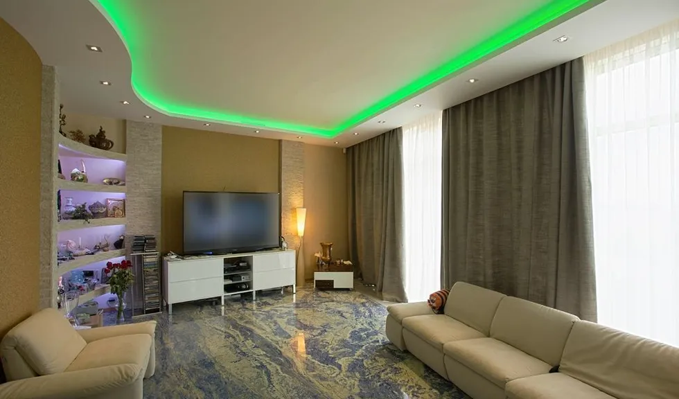 Проект квартиры со светодиодной многоцветной подсветкой, установленной на многоуровневых потолках. Основной изюминкой данного интерьера стал пол из оникса со светодиодной подсветкой. Для реализации проекта использовалось светодиодное оборудование торговой марки