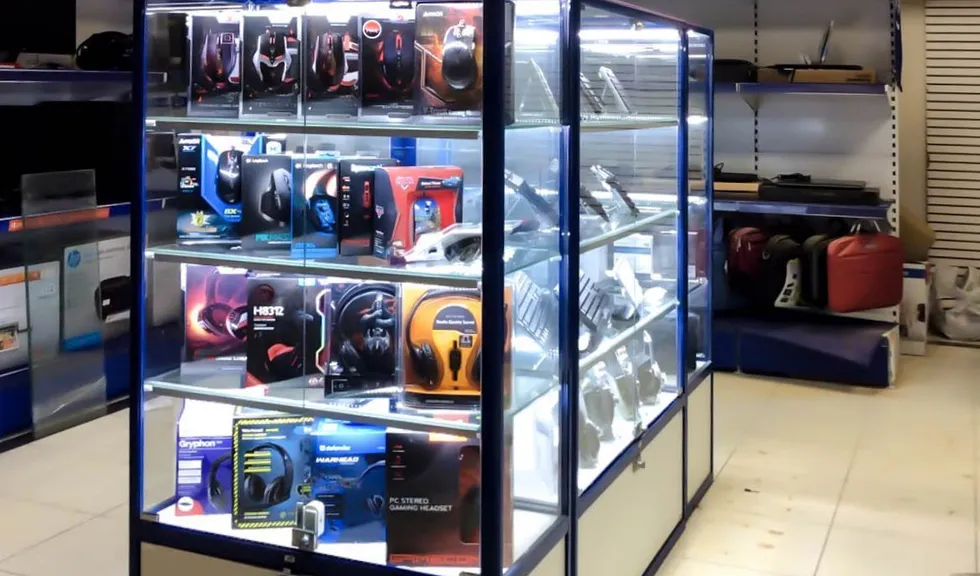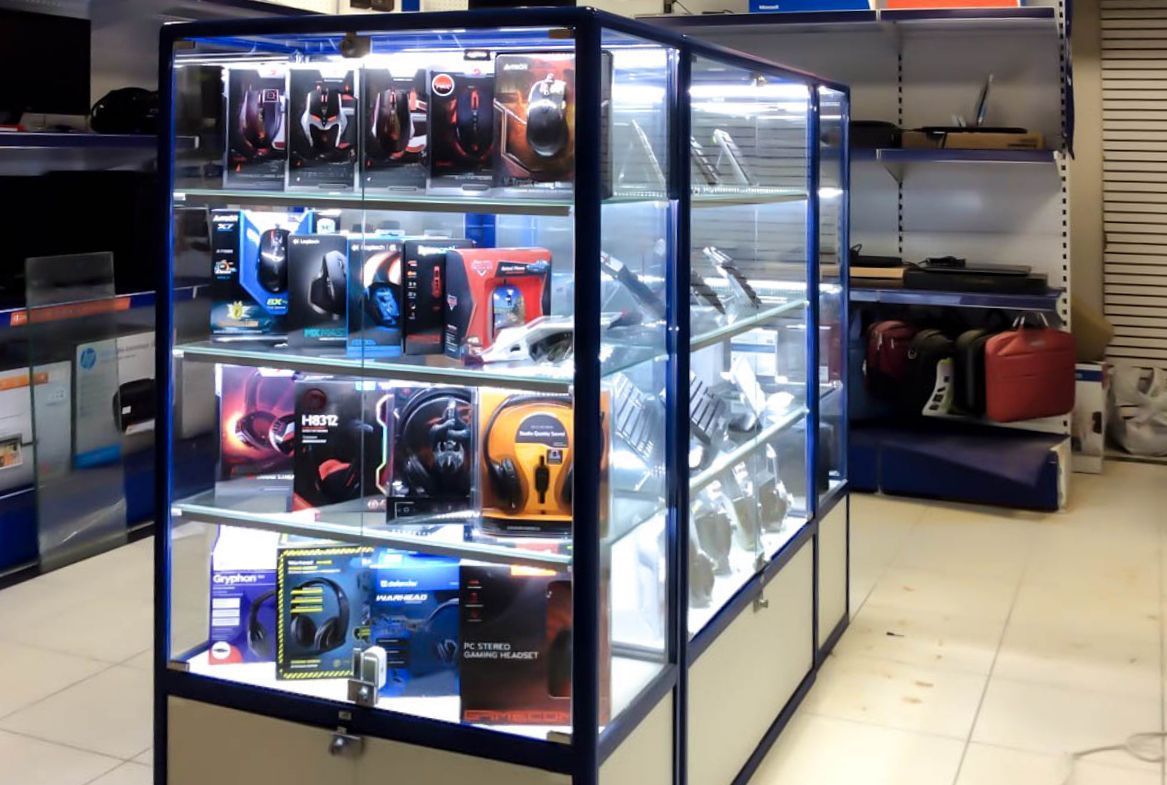 Подсветка стеклянных витрин в компьютерном магазине OLDI.