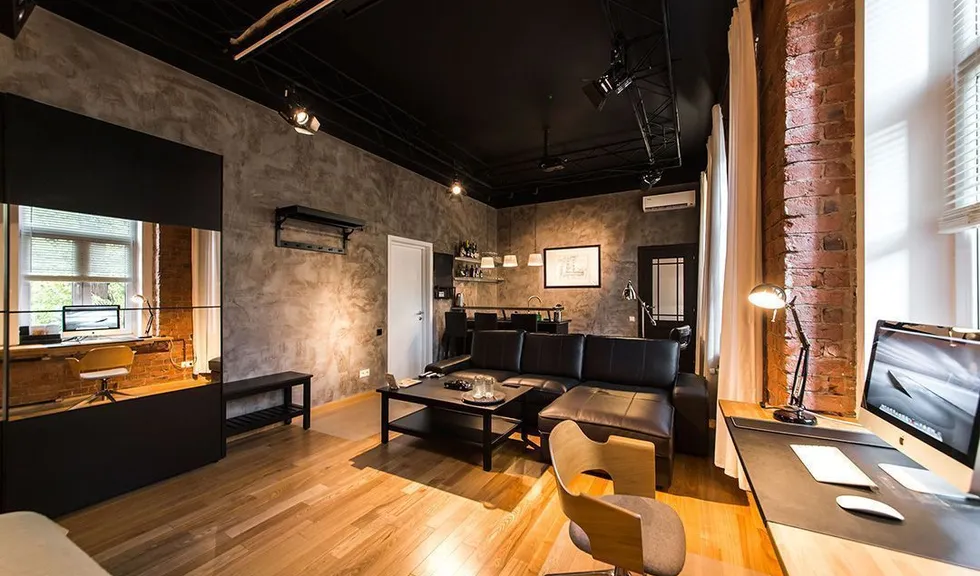 Интерьер московской квартиры-студии выполнили в стиле джазового кафе: кирпичные стены, дерево, обилие кожаной мебели. Особенной деталью этого интерьера стала ферма, установленная под потолком. На ферме подвешены софиты и акустические колонки.