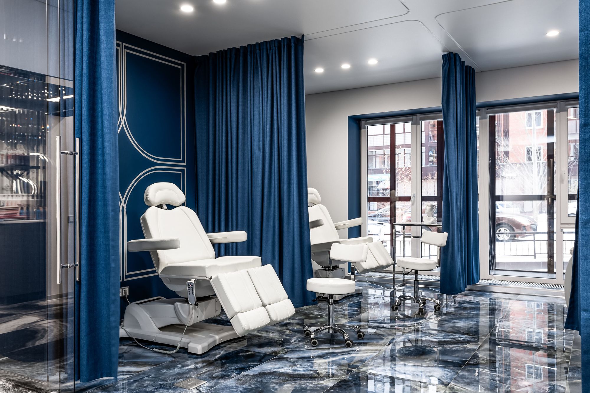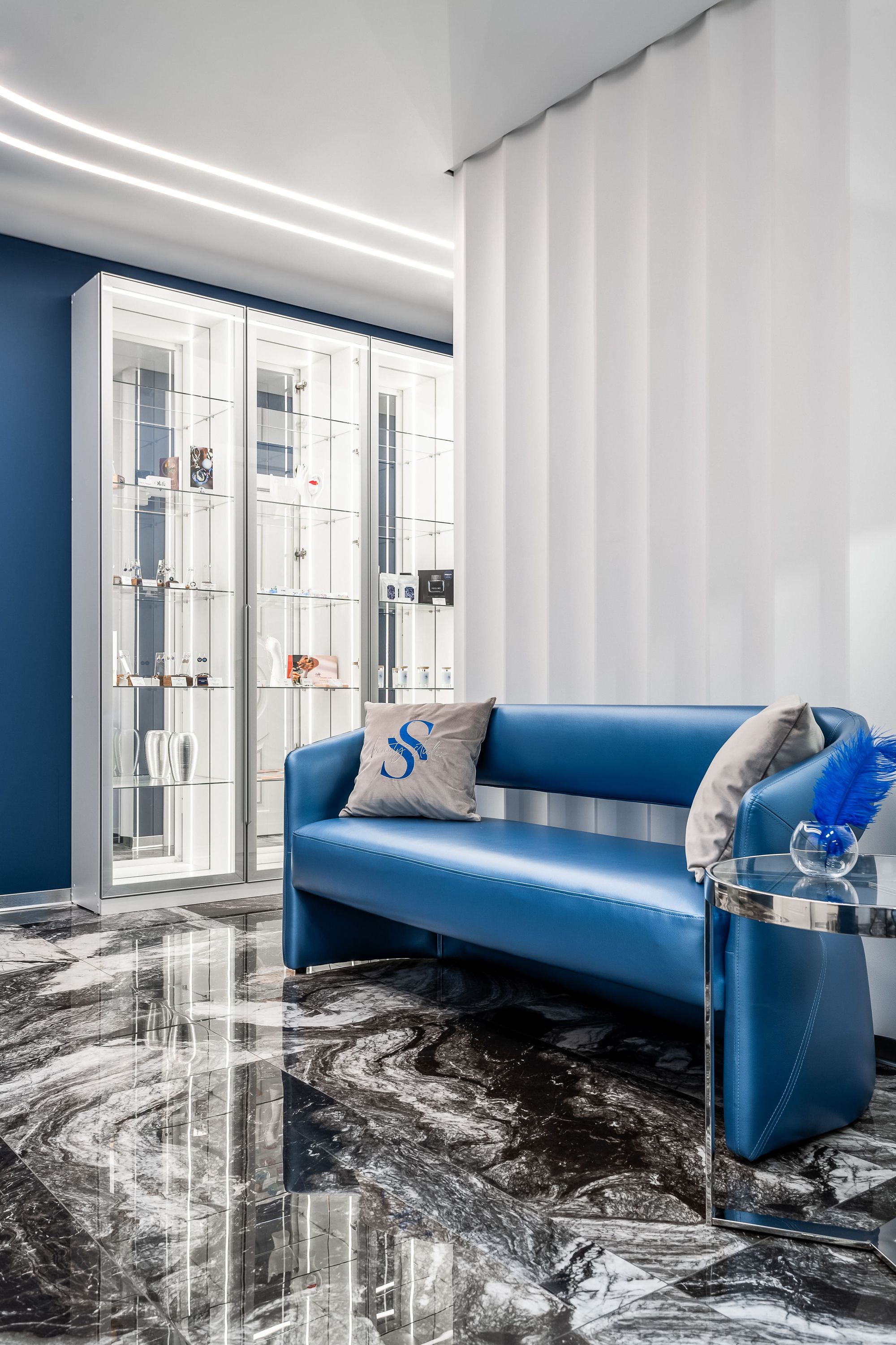 Интерьер салона красоты — в стиле контрастного и дерзкого футуризма с элементами ар-деко — заставит любую женщину почувствовать себя королевой. Роскошные панели и керамогранит, множество зеркал, водопады переливающегося стекла, оригинальная фотозона для клиенток — все эти элементы интерьера сливаются в единое синергическое пространство в том числе благодаря свету.