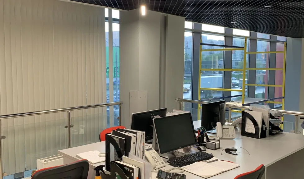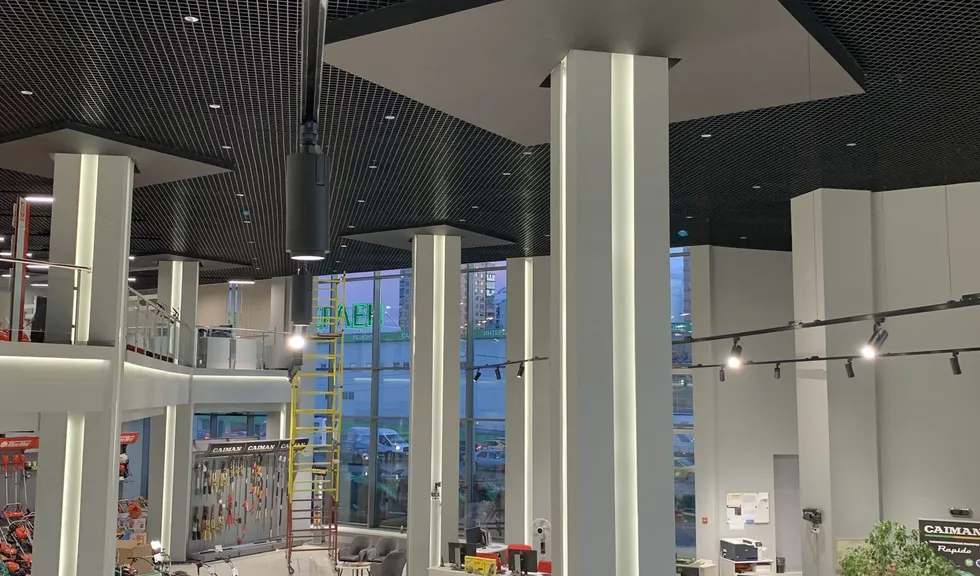 До реновации в шоуруме Caiman был стандартный белый потолок типа «Армстронг» с интегрированными в ячейки светильниками. Однако интерьер шоурума значительно преобразился после замены освещения и установки нового потолка.