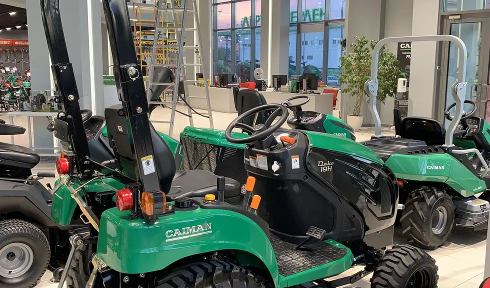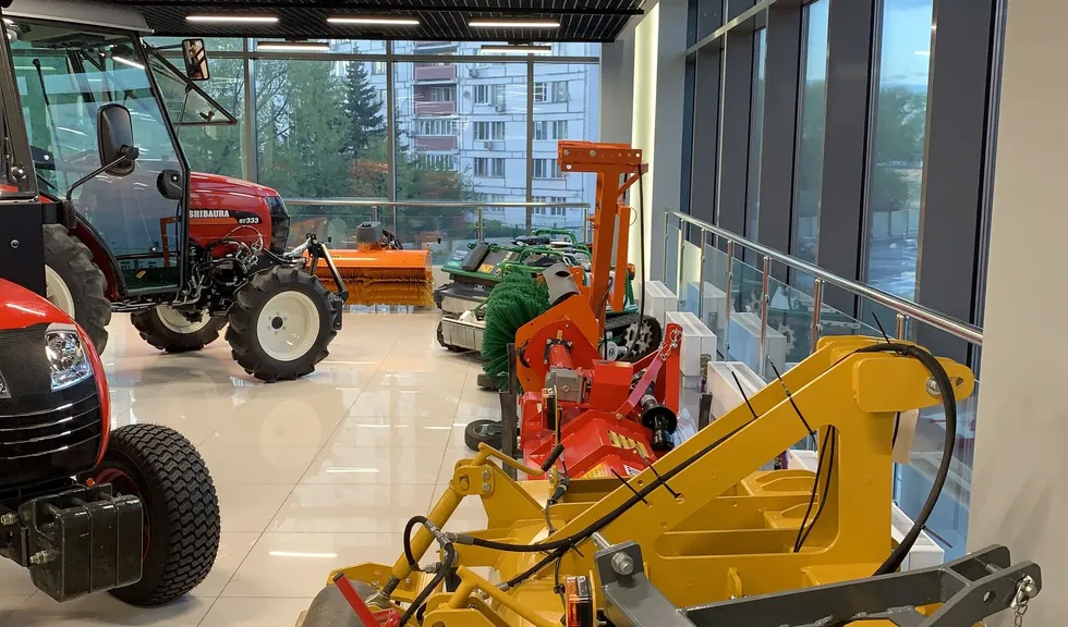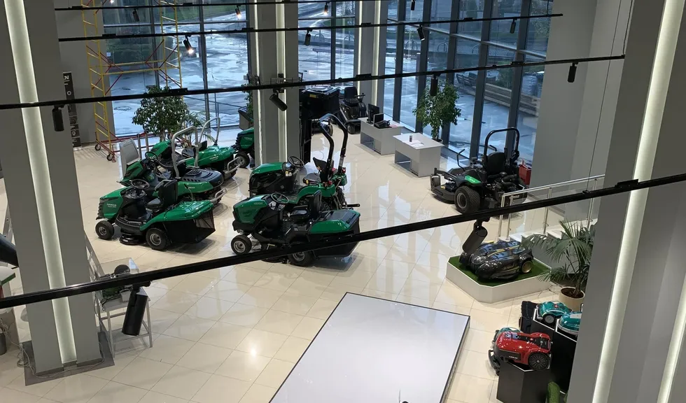 Сегодня на месте «Армстронга» — черный матовый потолок «Грильято». На его фоне линии трековых систем смотрятся стильно, подчеркивая техническую направленность шоурума. В выставочном зале с высокими потолками применяется комбинированное освещение: трековые светильники цилиндрической формы для расстановки световых акцентов и компактные встраиваемые даунлайты на потолке для основного освещения. Такое сочетание позволило создать в шоуруме гармоничный и комфортный свет для осмотра садового оборудования.