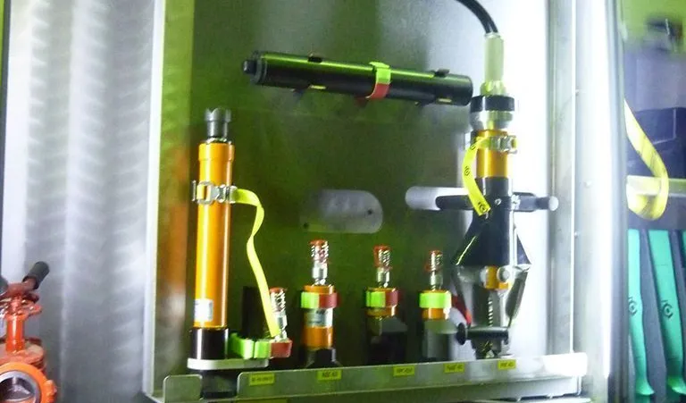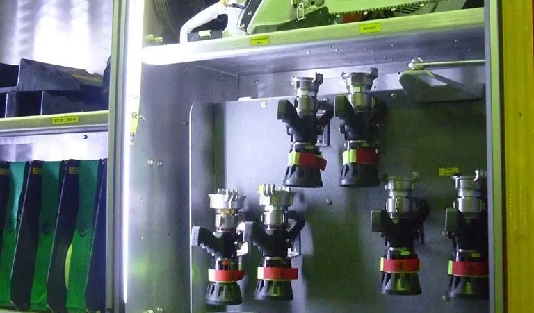 В них размещены инструменты, специальное оборудование, мостики для пожарных шлангов и сами пожарные шланги.