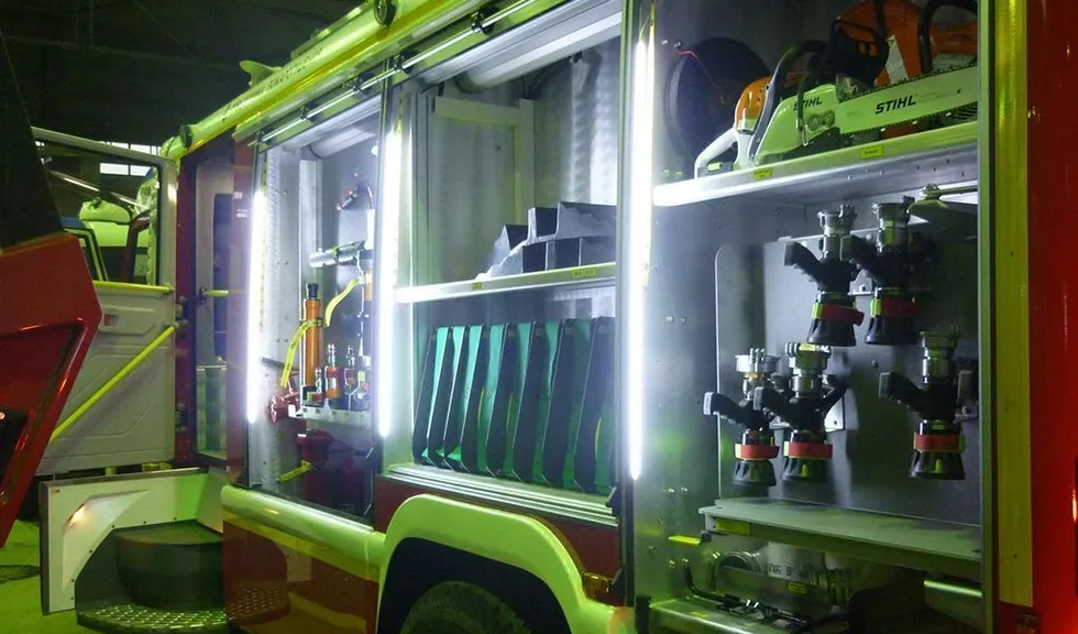 Для демонстрации пожарного автомобиля на выставке спецтехники была установлена светодиодная подсветка его отсеков.