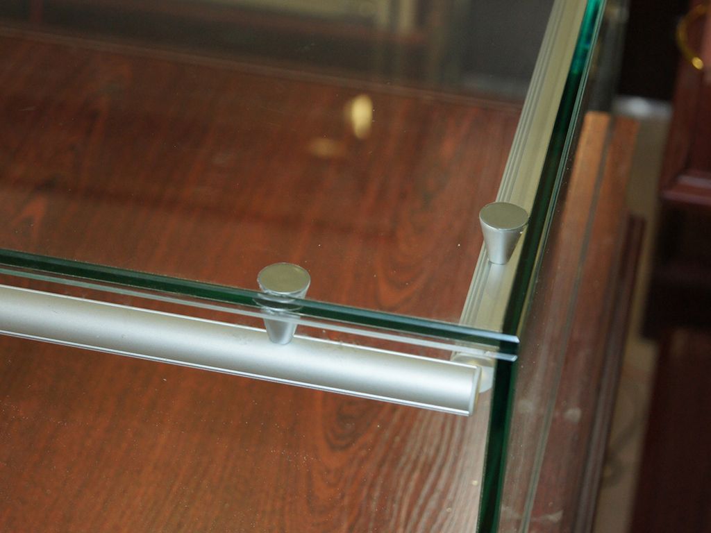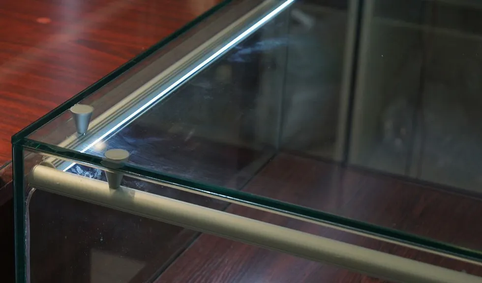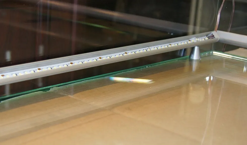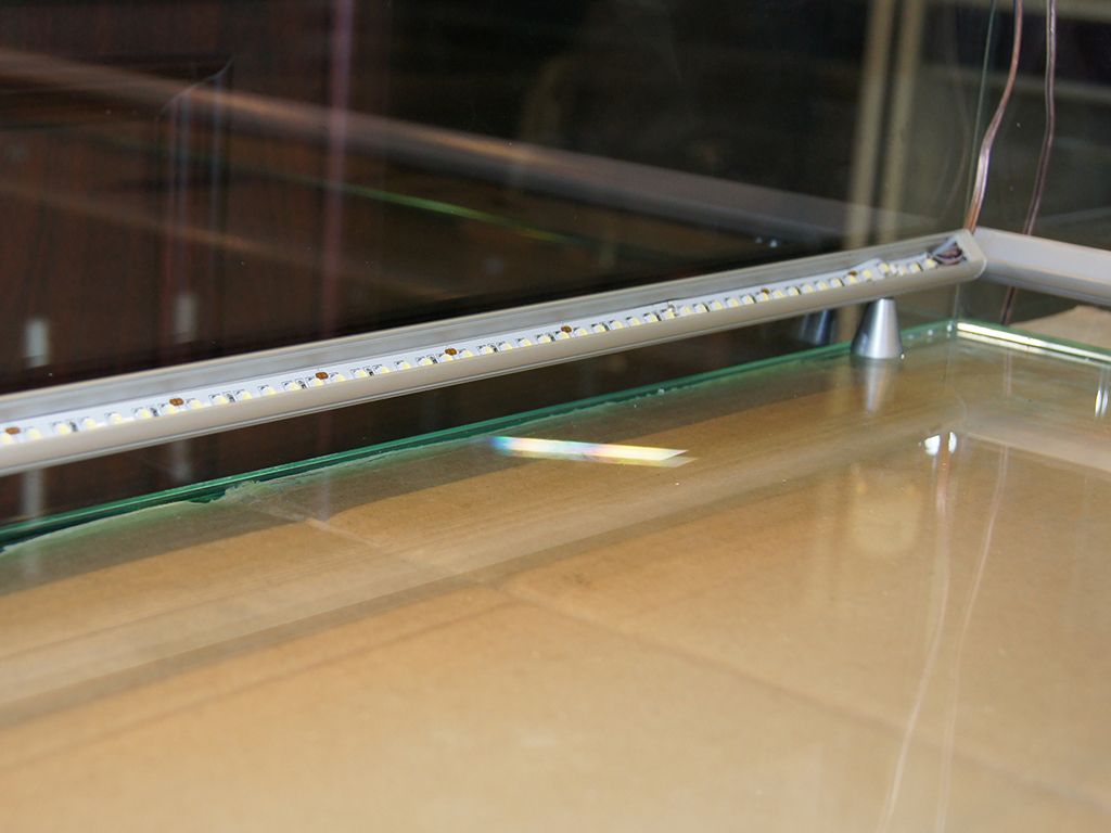 Подсветка другой витрины так же выполнена с использованием алюминиевого профиля, для этого выбрали модель круглой формы. Профиль установили на верхнее стекло витрины при помощи специальных держателей. Он был установлен под углом и закрыт матовым светопропускающим экраном, поэтому свет направлен именно на выставляемую продукцию и при этом не "бьёт" по глазам.